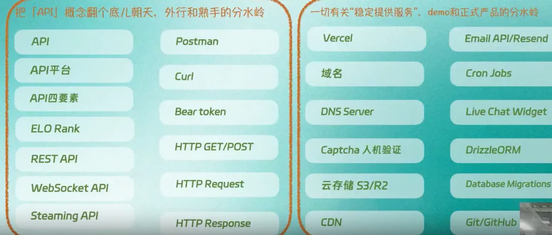 第二件事,是你怎么把自己的网站或产品,稳定地交到用户手里,也就是右边这一堆上线、部署、域名、数据库、邮件、存储这些东西。