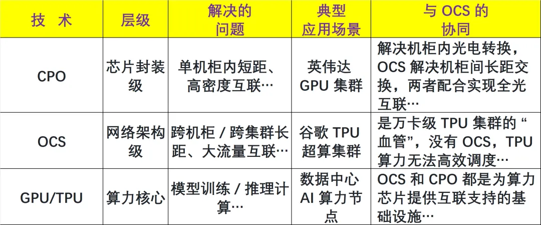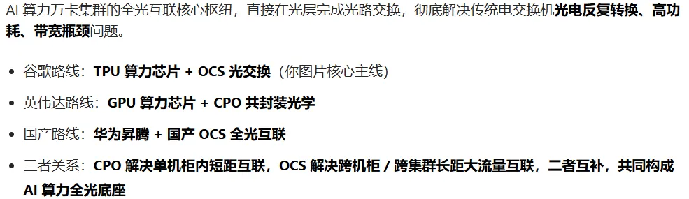 CPO 管 “芯片到机柜”,OCS 管 “机柜到集群”,两者共同构成AI算力的全光互联体系,是算力扩张的底层前提。