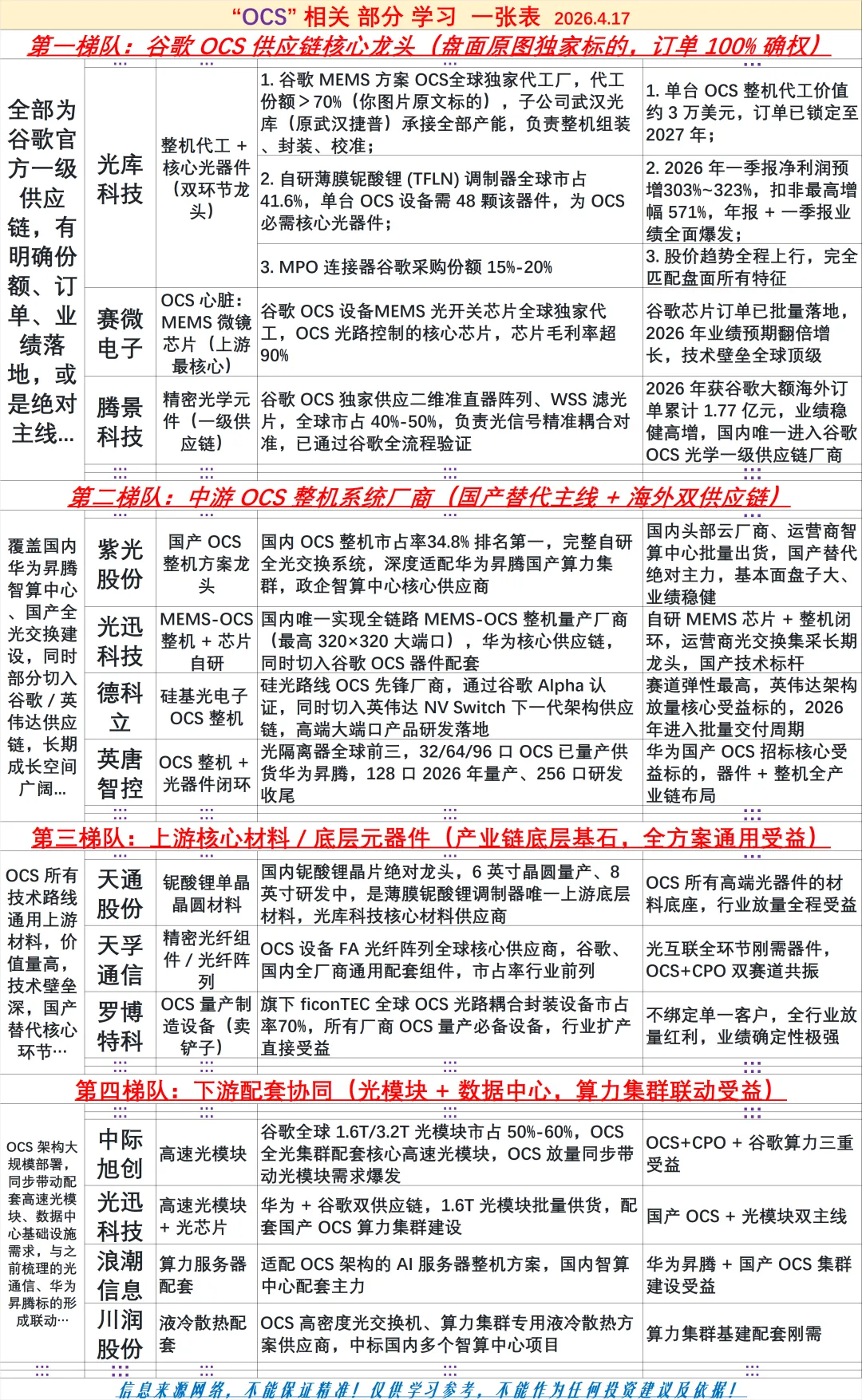 谷歌 TPU 集群出货量:每 4096 颗谷歌 TPU,需配套 48 台 OCS 设备,需求完全绑定算力扩张...光库科技很厉害的公司,谷歌OCS70%独家代g+核心器件双龍头+2026Q1业绩爆发,持续可关注学习...👆👆👆内容仅供吾学习参考!不能作为任何投资依据!文章提及的公司只学习&不推荐!不对任何人构成任何投资建议!👆👆👆若汝想与吾一起好好学习↑天天向上↑共进步!不迷路!或关注!👆👆👆