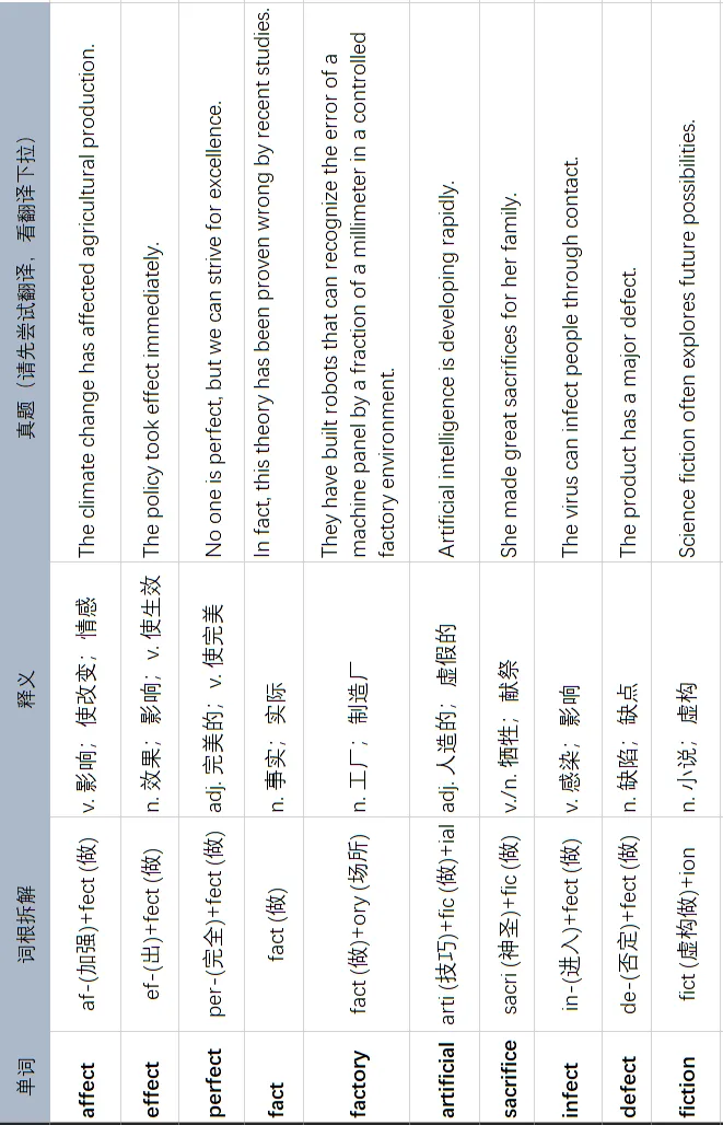 fac/fect/fic 这一组词根的核心含义是:——做,制作,完成(to do, to make)。贯穿:行动——结果——状态的完整语义链,衍生出:制造、完成、影响、使成为等多层含义。