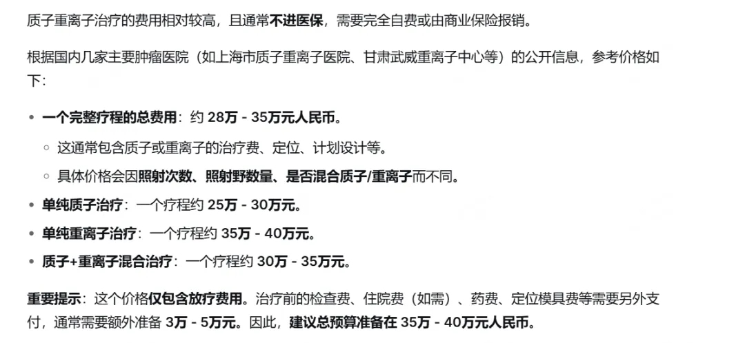 一般来说,质重治疗过程中,几乎没有普通的放化疗,因为质重本身就是放疗了。但是,如果真的遇到某些客户,医生让他做完普通的化疗,再去质重,那这部分治疗费用,需要普通的化疗费用,需要在责任内的医院完成。 比如某个产品的民营医院范围,没有扩展上海质子重离子医院,被保人去上海质重,完成普通化疗+质重的时候,普通化疗这部分费用,会免责剔除不理赔;此外,靶向治疗等,如果同时存在,这部分费用也会剔除。 质重治疗的价格,取决于医院的设备,有些是国产的就相对便宜,价格的话,网上查了一下供参考,一般质重治疗,一个疗程就结束了,所以这个价格都是一个疗程的价格。普通的放化疗,每个疗程的价格差异比较大,可以自行对比。 案例参考:乳腺癌术后,化疗+靶向治疗后,到上海质重医院,质子放疗,1个疗程,质子治疗费用27.8万。加上其他费用,整体金额35万左右,理赔金额应该是33万左右,有一部分非责(超适应症用药)。