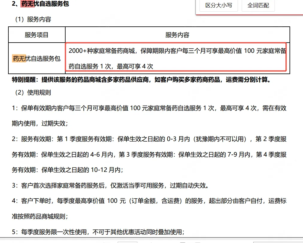 1、e享外购药,不是责任,是增值服务;用于"协助开处方" 2、药无忧,这个是增值服务,只有尊享中高端2025计划二、和plus才有;每个季度,赠送50元或100元的药品,药品种类可以自选。下图是PLUS的服务手册,100元/季度(中高端25是50元/季度)。 3、另外还有一个服务,容易弄混,叫"直赔购药服务",主打原研药/进口药,众民保中高端2026享有、众民保百万医疗险2025享有,如果投保了原研药加油包,也可以享有。 4、如果是问,和购药有关的责任理赔,不同产品不一样的: 尊享e生有"药省保" 尊享中高端有门急诊加油包,中包含"互联网购药保险金" 众民保中高端有原研药"在线问诊药品费用医疗保险金"