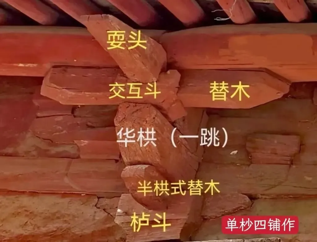 出1跳(四层构件):栌斗+出跳的华拱或昂+耍头+衬方头