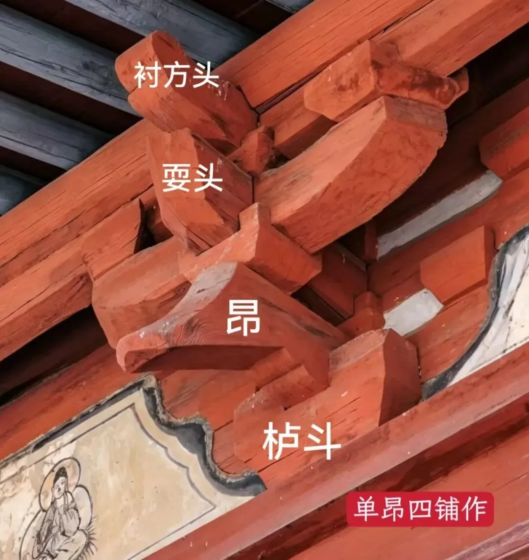 单杪单昂五铺作:2跳,第一跳华拱+第二跳昂(宋代最经典常用);