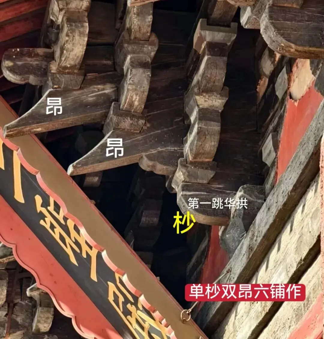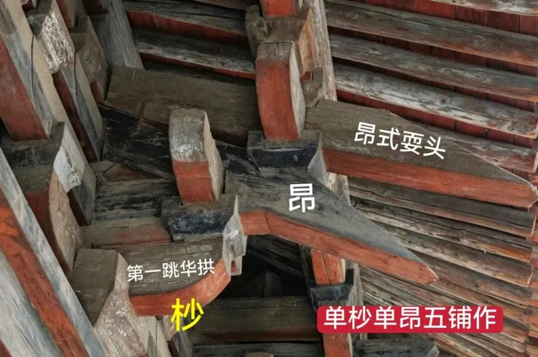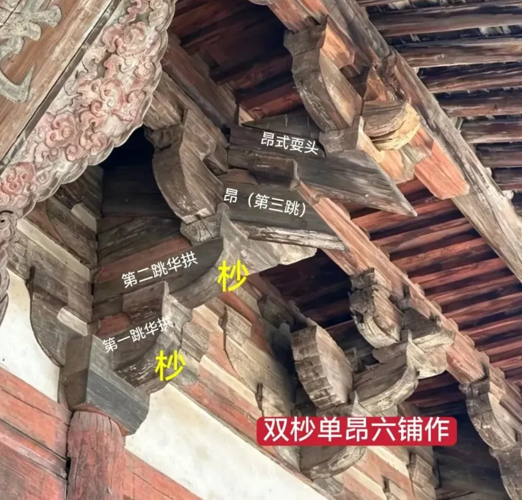 双杪单昂六铺作:3跳,两跳华拱+一跳昂;