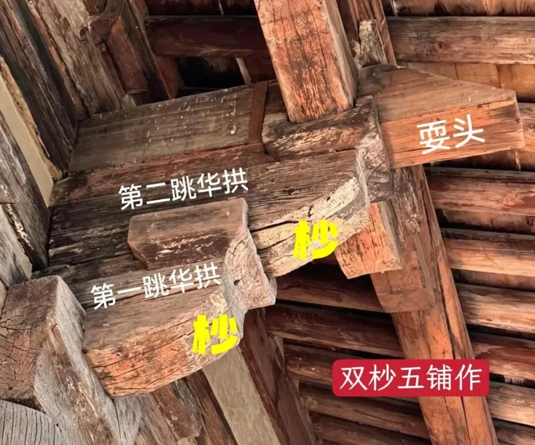 双杪五铺作:2跳,两跳均为华拱,无昂。