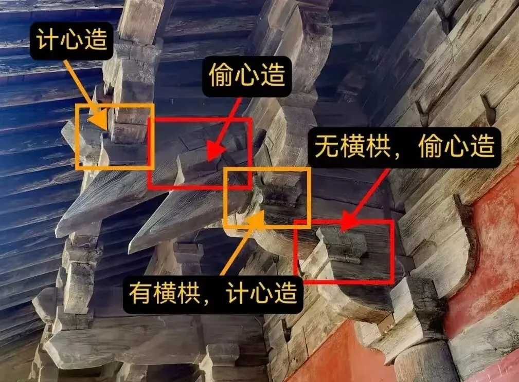 3.一眼区分:看斗拱侧面:能看到横着的拱是计心造;只有一层层向外伸的臂是偷心造。也有混合做法,下面几跳偷心,最外一跳计心,也很常见。(凡铺作逐跳上安拱,谓之“计心";若逐跳上不安拱,而再出跳或出昂者,谓之“偷心”。——《营造法式》)