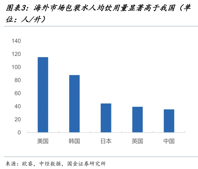 一方面是包装水代替自来水的饮用习惯有待持续培育,我国整体人均收入还是较低,新一代年轻人对包装水的接受度会比老一辈更容易接受;另一方面是健康视角下包装水对碳酸饮料、果汁等饮料具备替代机会。