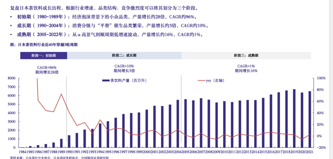 基于银河证券研报的调研分析,日本无糖茶穿越40年周期,消费分级时代最具弹性。日本茶饮料(无糖茶为主)是最大的饮料品类,并且穿越40年产业周期,期间销量实现185倍增长,竞争格局呈现“一超四强”的稳态竞争特征,诞生了长期领跑行业的头部企业伊藤园,戴维斯双击推动公司