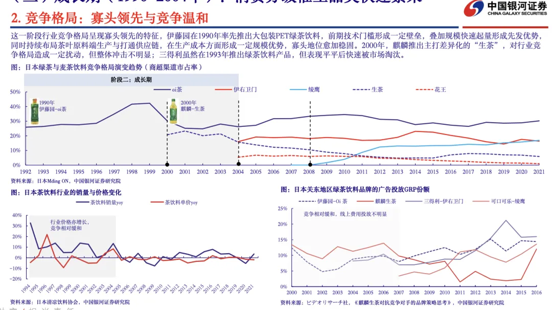 当饮料的问题是可复制性强,容易出现仿品,我们不得不思考竞争的影响。仍然参考银河证券复盘日本的无糖茶竞争,发现农夫的做法和发展路径和日本龙头如出一撤,完美复现。