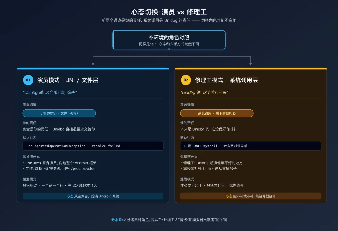 系统调用层的问题和 JNI、文件层有一个本质不同:前两者是 Unidbg 明确把责任交给你,你不补就肯定不行;系统调用层是 Unidbg 自己想干却没干好。理解这个区别,是从"补环境工人"晋级到"模拟器贡献者"的分水岭。