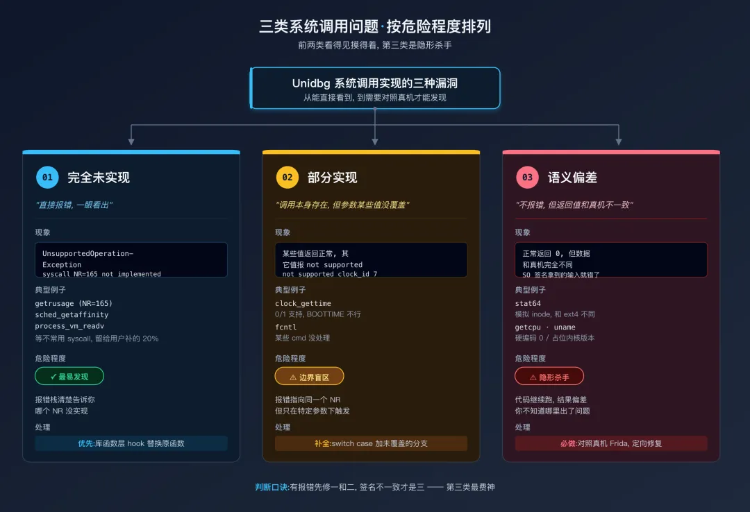 那为什么还要补?因为 Unidbg 不是 Linux 内核,它只是一个有限的近似。这个近似有三种"漏洞":