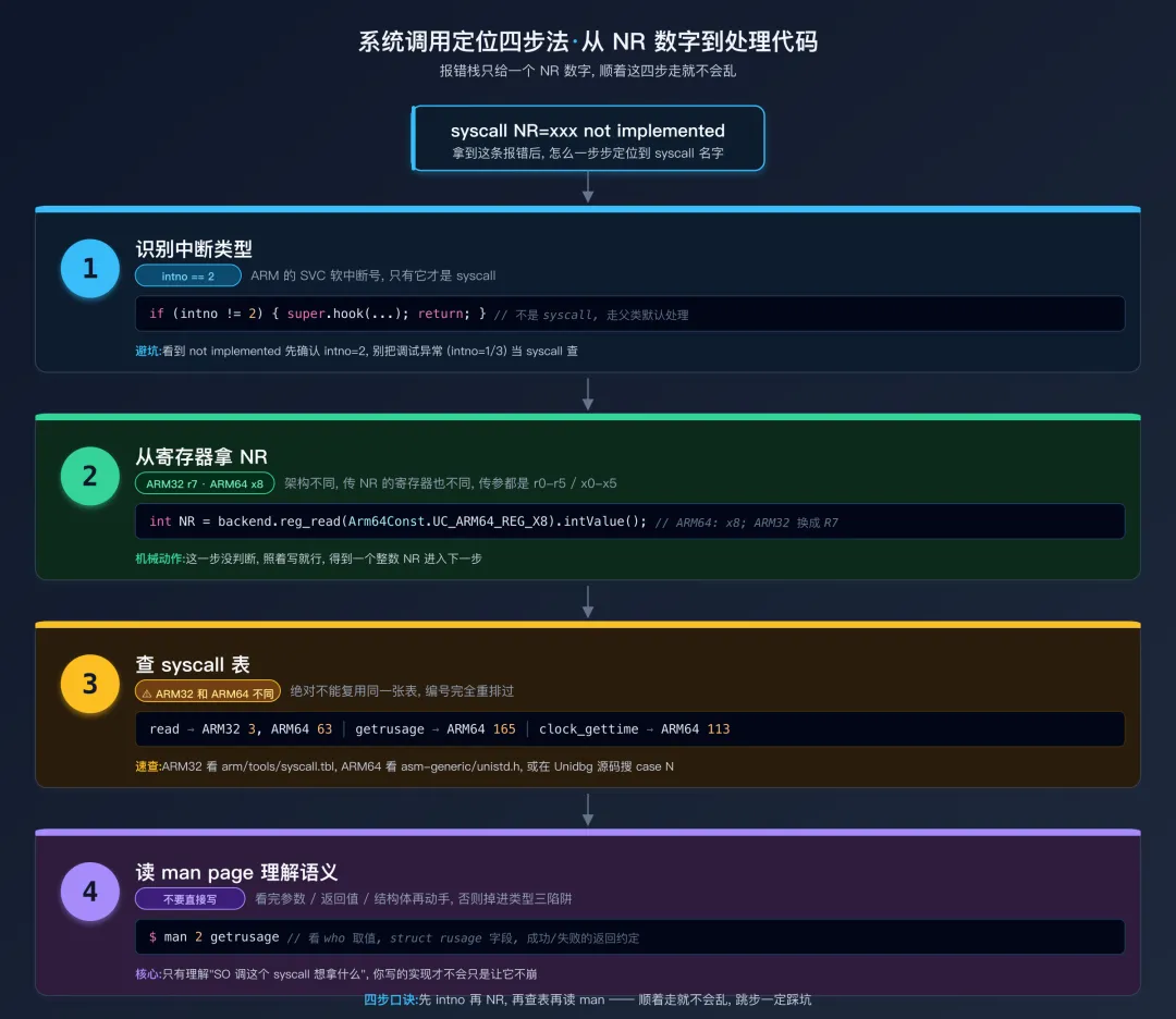 报错栈给的信息往往很简略:syscall NR=xxx not implemented。要从这个数字快速定位到处理代码,需要一套查找流程。