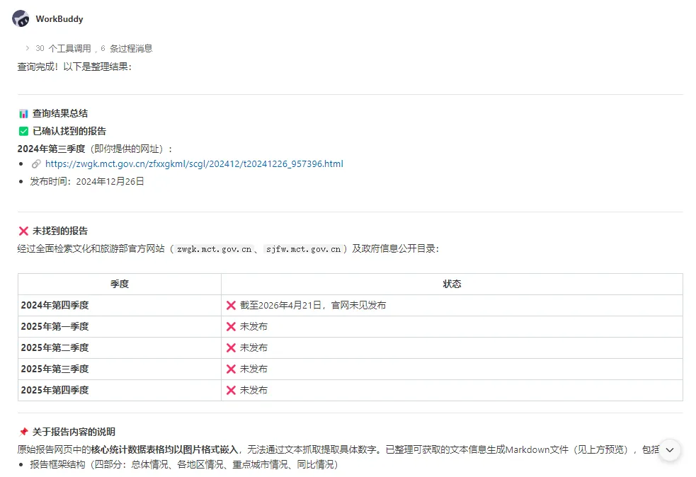 今天让WorkBuddy帮我再找一次,看看是不更新了,还是我之前没有找到合适的地方。https://zwgk.mct.gov.cn/zfxxgkml/scgl/202412/t20241226_957396.html 这是“2024年第三季度全国星级旅游饭店统计调查报告”,请帮我找一下这个网站,是否还有2024年第四季度和2025年四个季度的全国星级旅游饭店统计调查报告,如有请帮我找到后把网址反馈给我,并将网站上的内容行程markdown格式给我。
