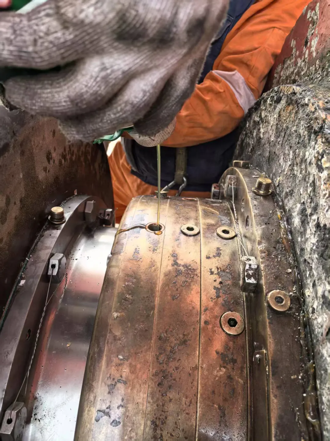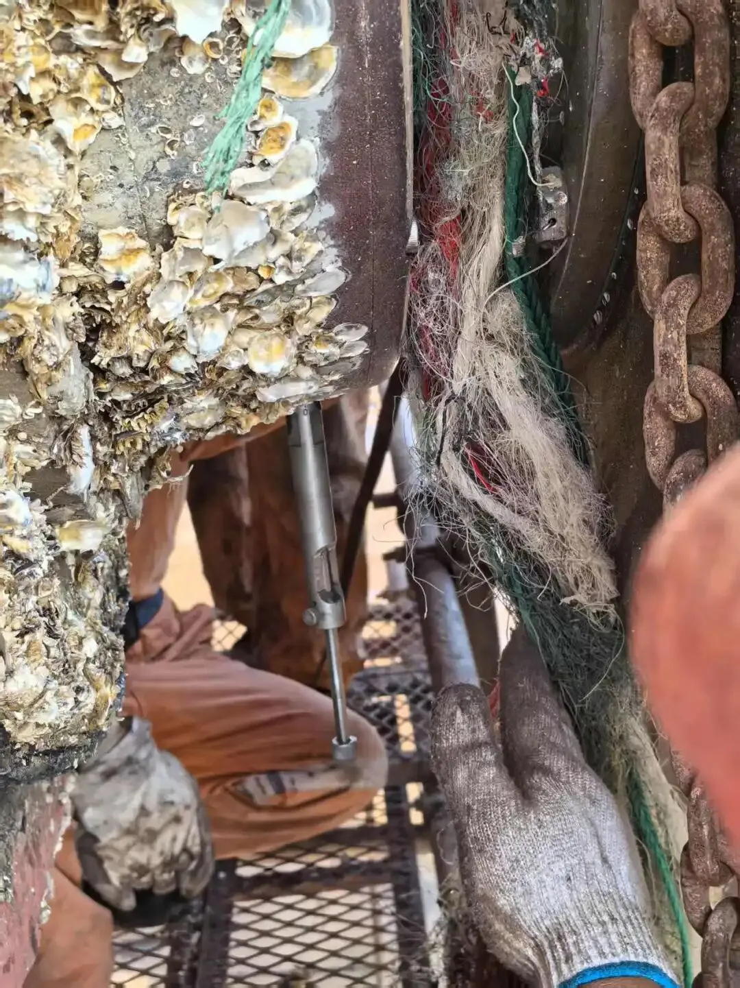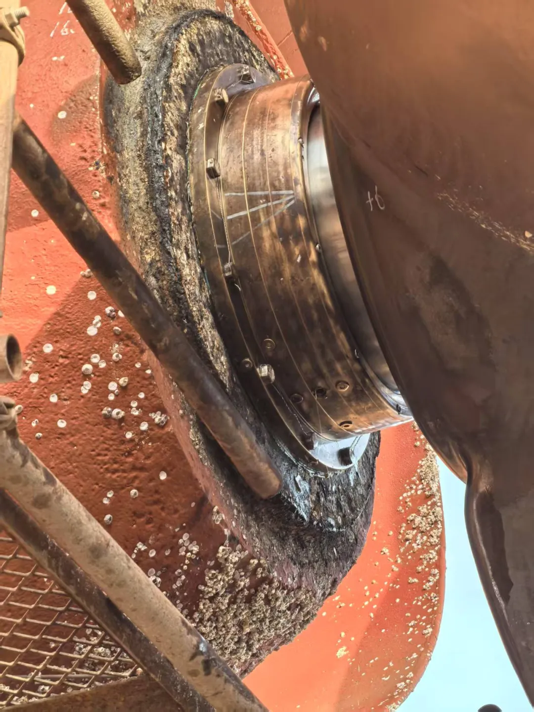 某轮坞修期间进行尾轴密封的拆卸检查,遇到了最易导致尾轴密封失效,固定螺栓异常磨损的根源——尾轴缠上了渔网。
