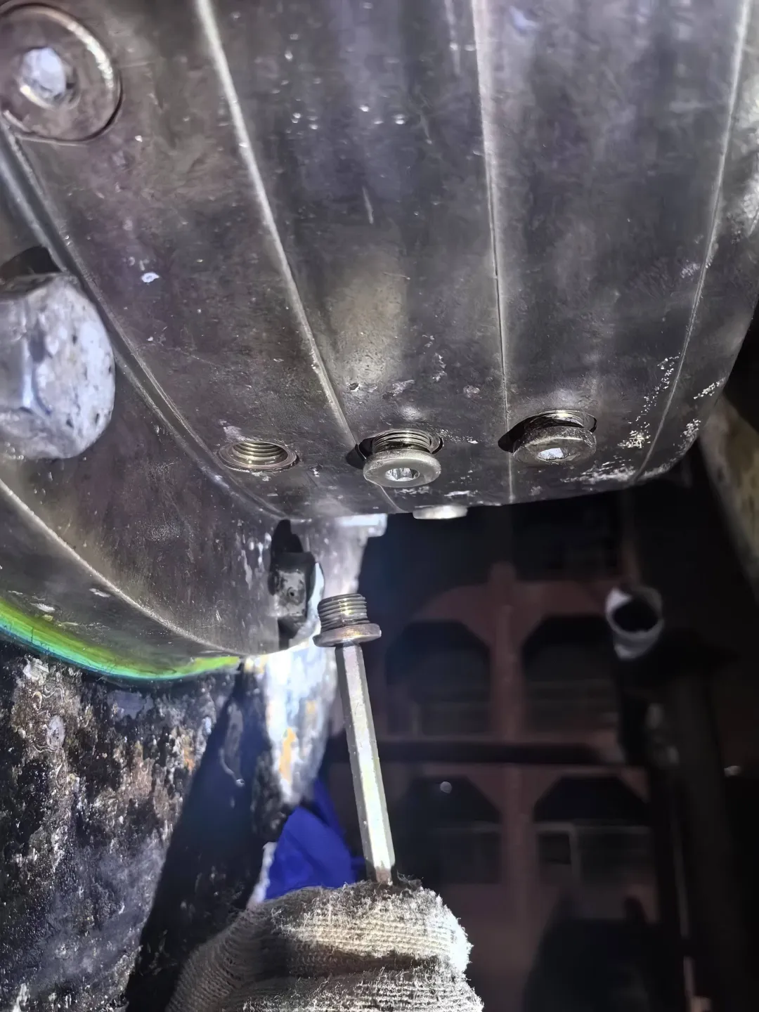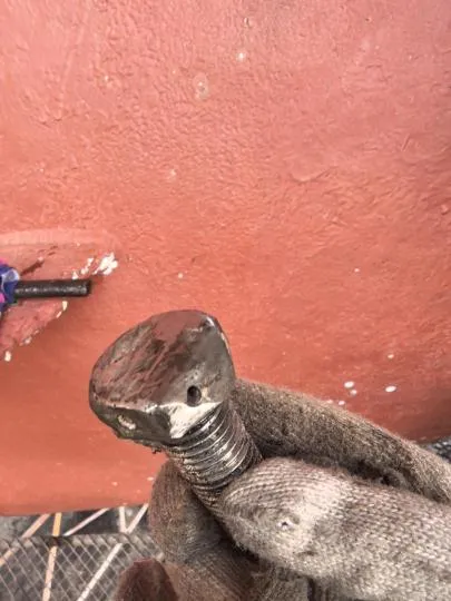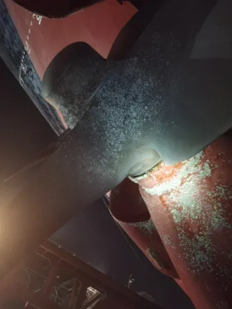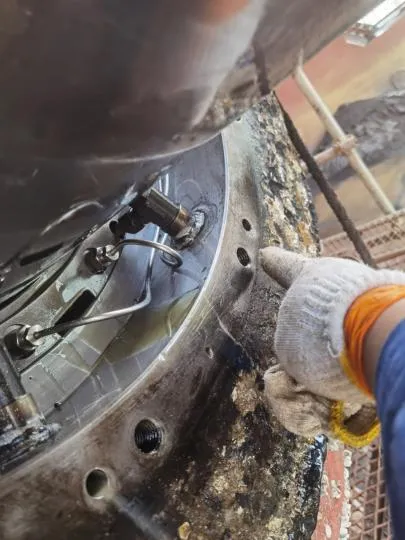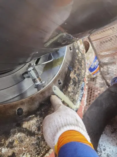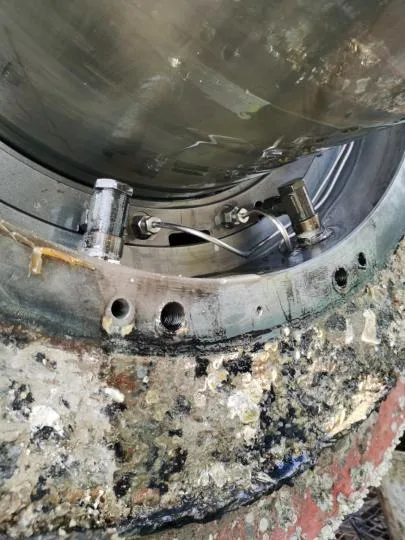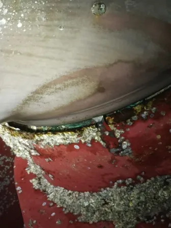 渔网罩变形,上部渔网刀剐蹭螺旋桨,网罩尾部与螺旋桨间隙呈上小下大形状。螺旋桨桨毂及叶根被摩擦的很光滑。白钢套装配螺栓头部严重磨损,无法再次使用。分析可能螺旋桨一开始缠了较大渔网,经过长时间摩擦,最终剩部分渔网进入尾密封导致泄漏。