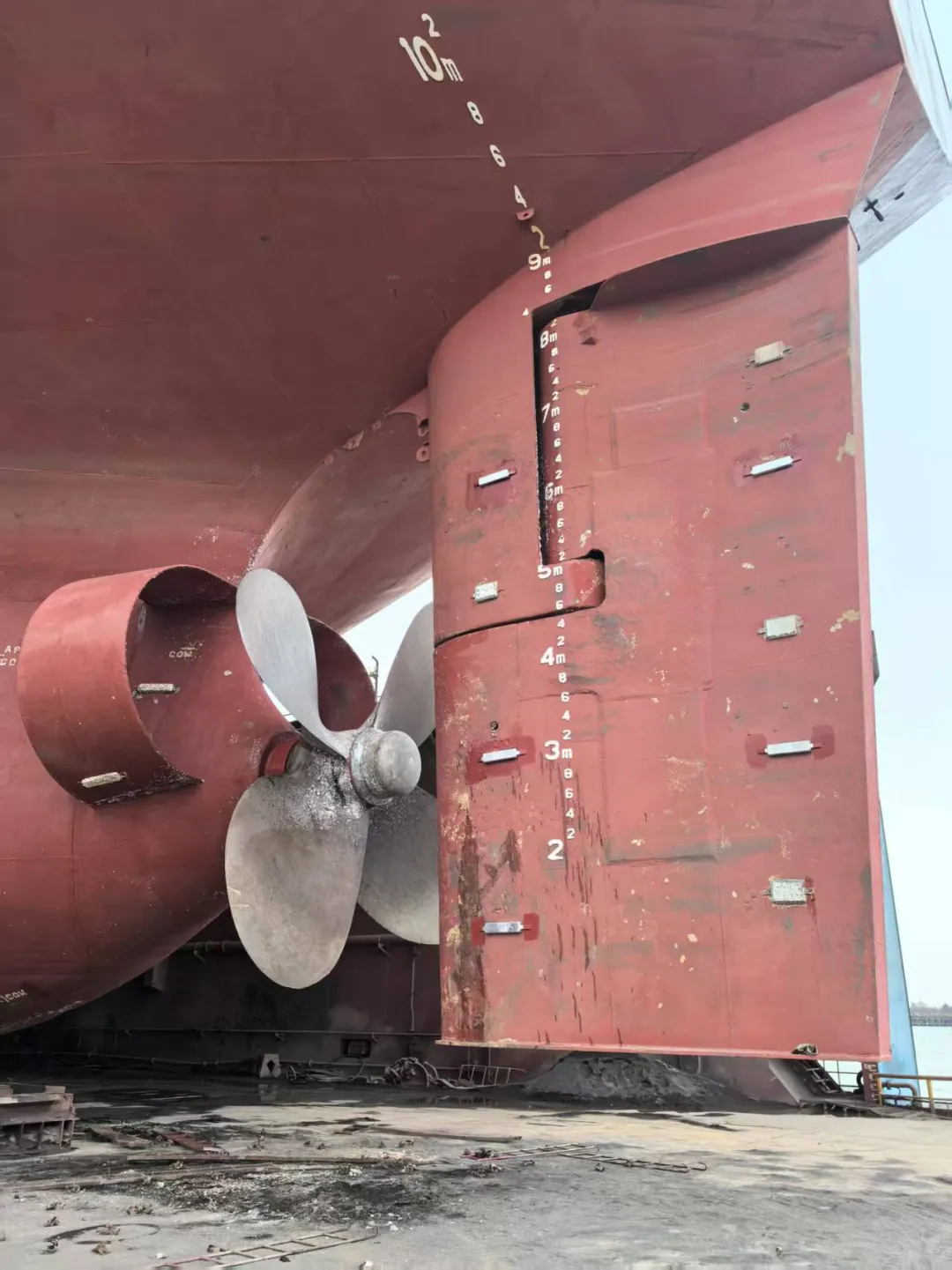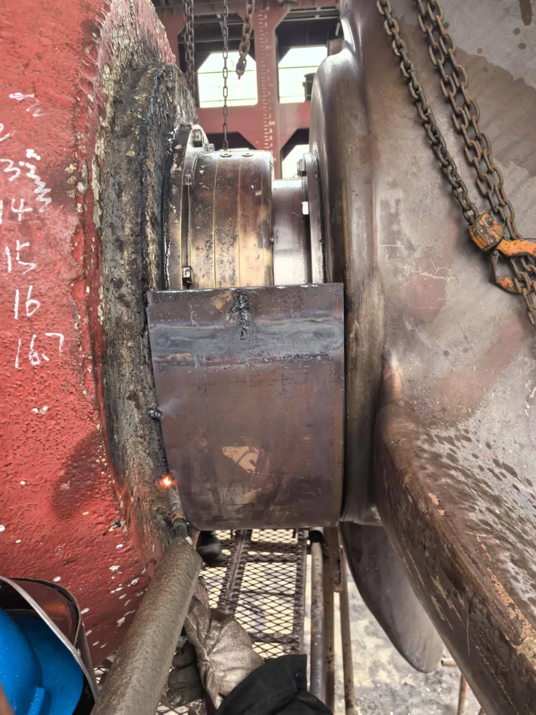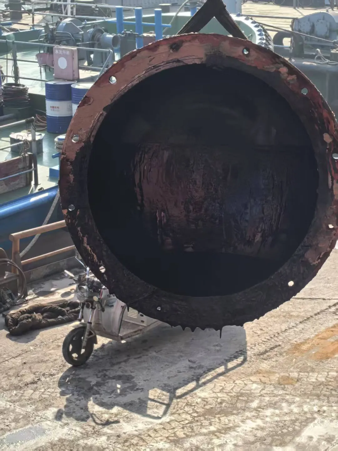 渔网罩更换加厚钢板10mm,与螺旋桨间隙调整至5mm左右,定位焊接,内部焊渣用高压空气吹除,4把渔网刀焊接,油漆。