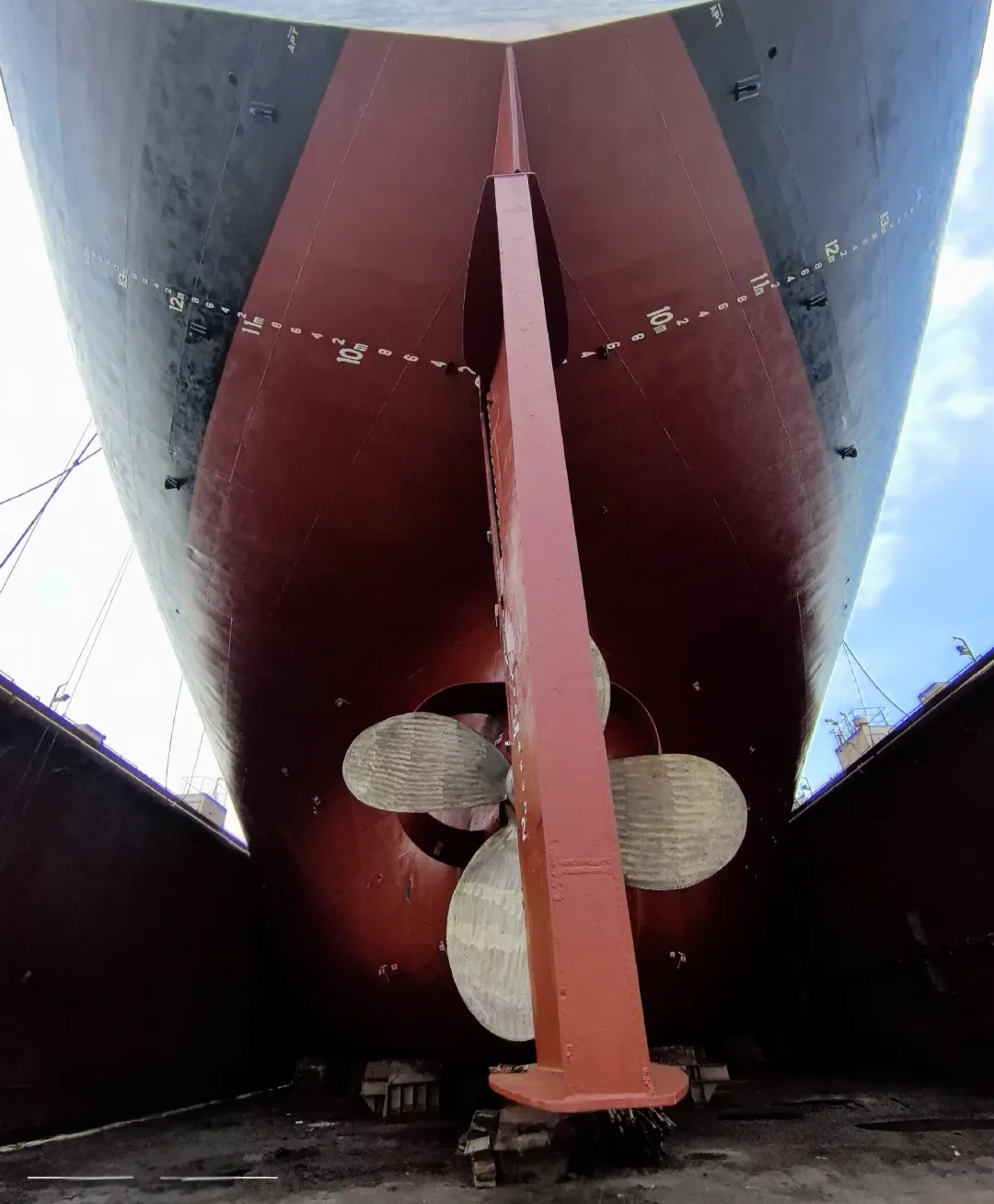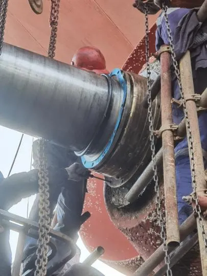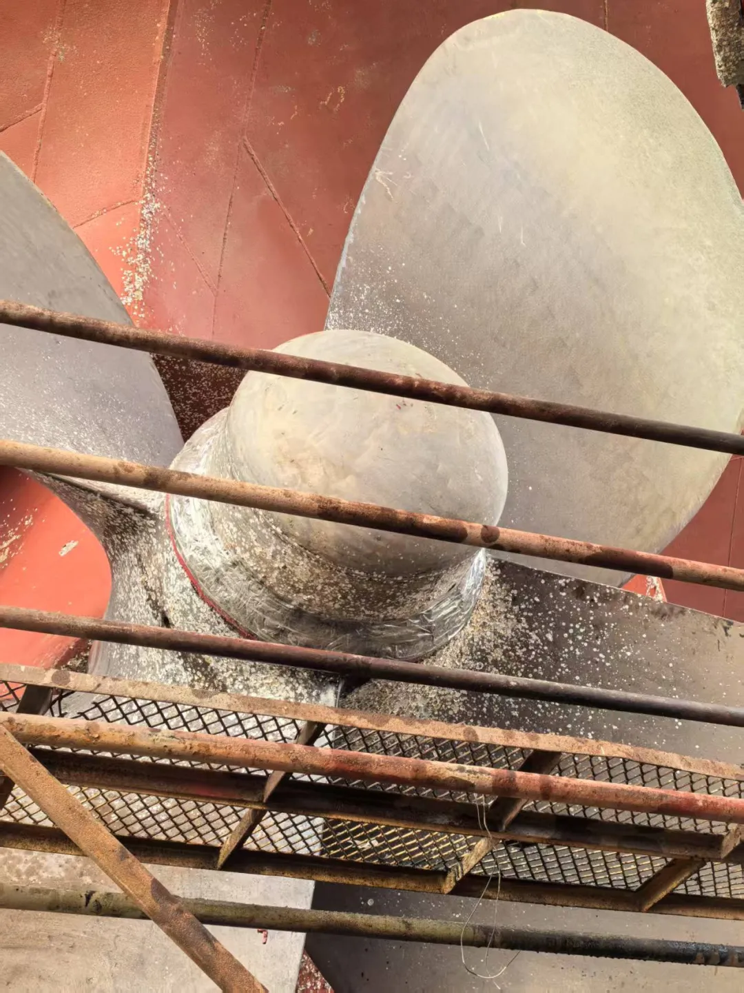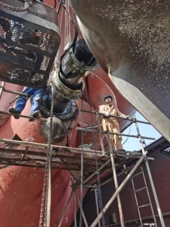 渔网罩更换加厚钢板10mm,与螺旋桨间隙调整至5mm左右,定位焊接,内部焊渣用高压空气吹除,4把渔网刀焊接,油漆。