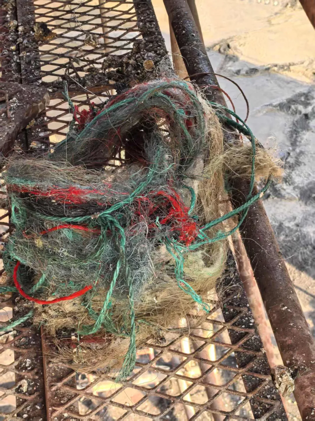 拆卸前检查外观,发现防渔网罩内部缠绕大量渔网