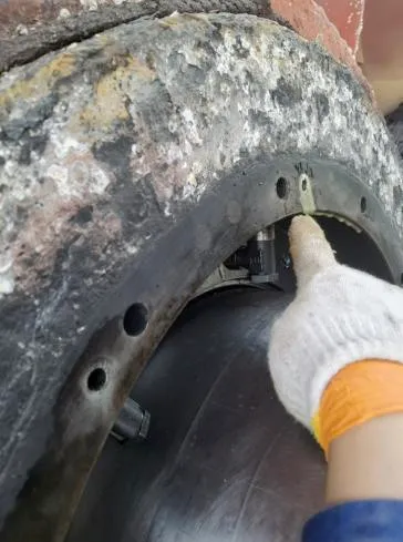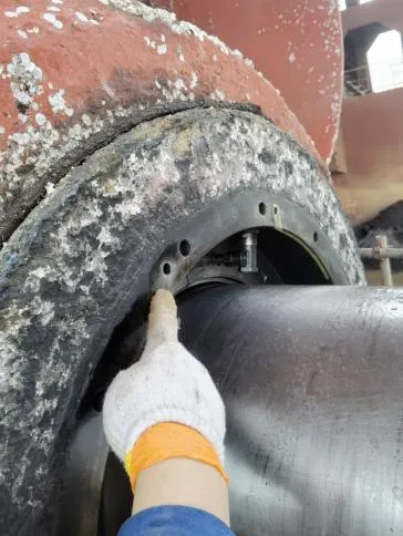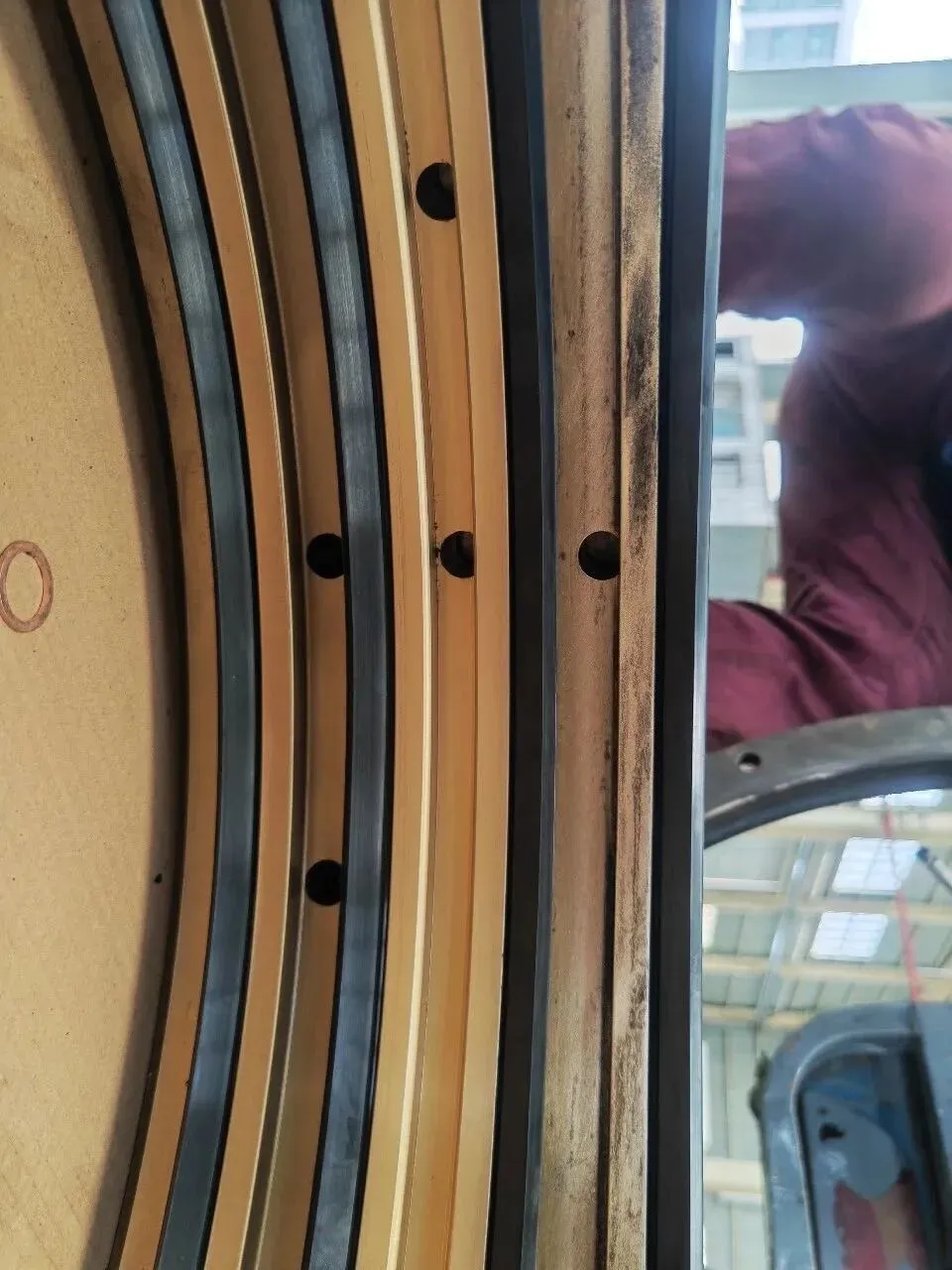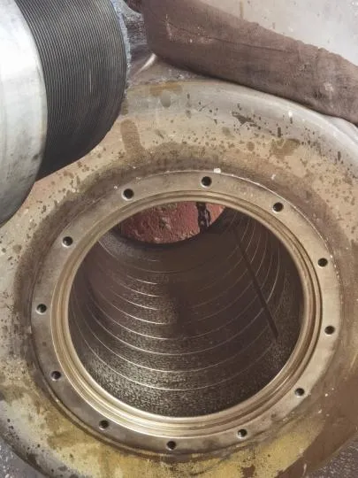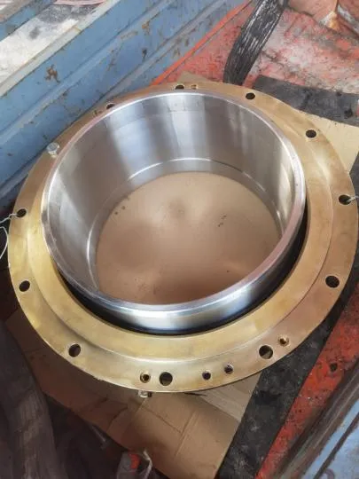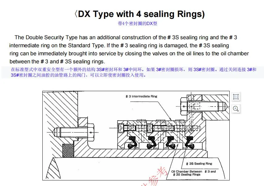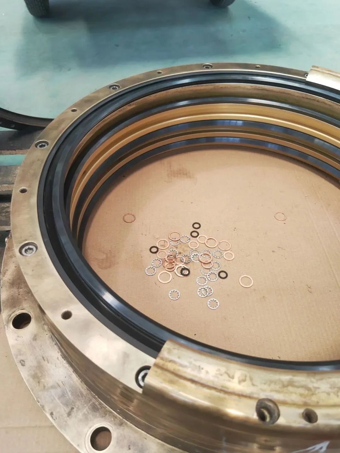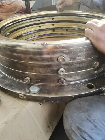 尾密封解体清洁,明显可见尾密封尾部铜质压环被磨出约3mm凹坑,4道橡胶环唇部均有不同程度磨损。尾密封更换新件,装配。