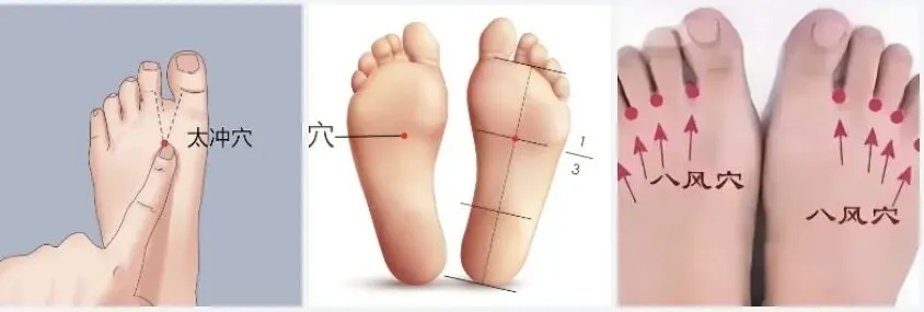 八风穴直接疏通趾间经络,给“湿毒”以最近出路;涌泉、太冲引肝经、肾经热毒下行 。