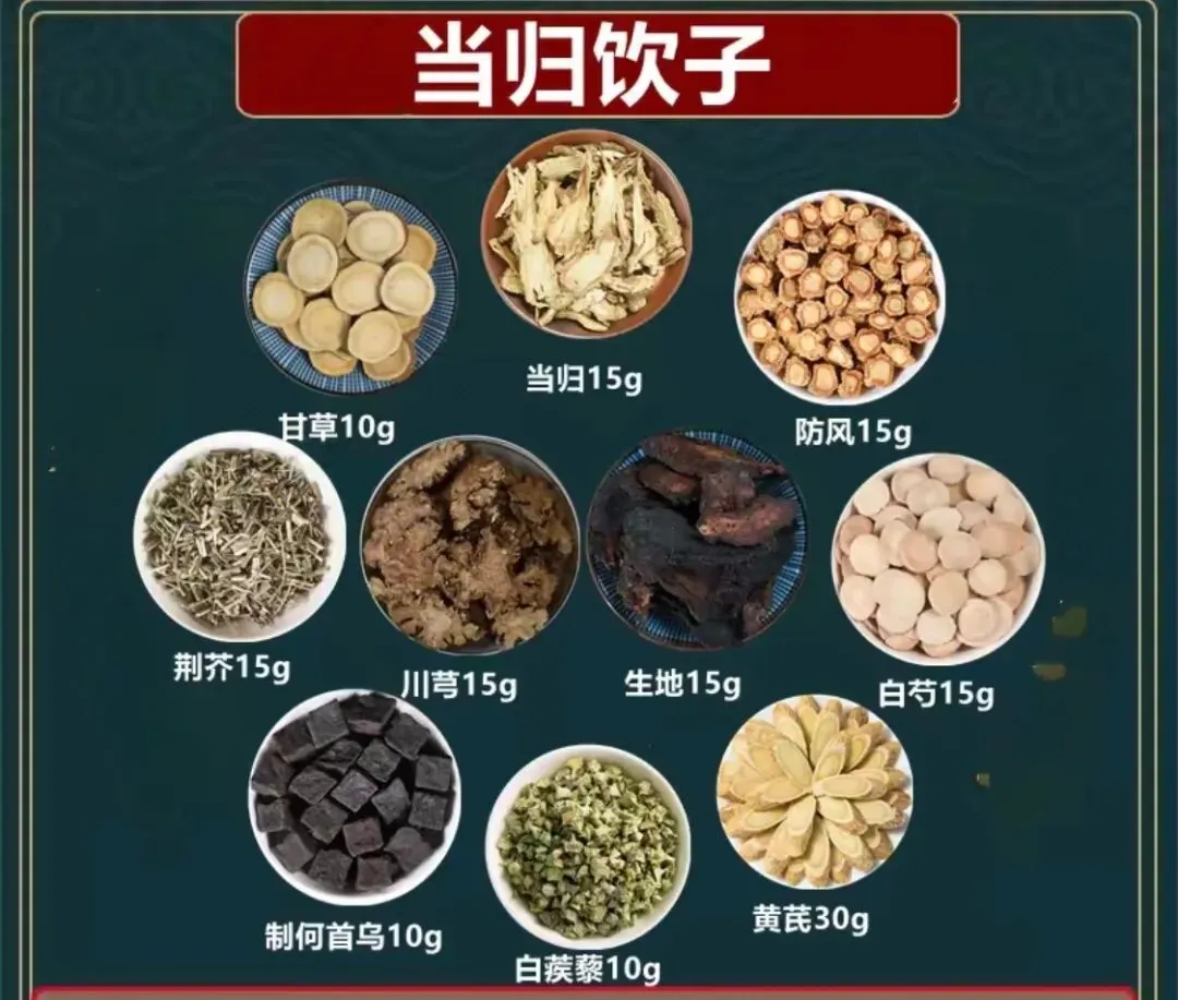 ②血虚风燥) : 当归饮子 (当归、生地、白芍、川芎、何首乌、荆芥、防风、白蒺藜、黄芪、甘草)加减。