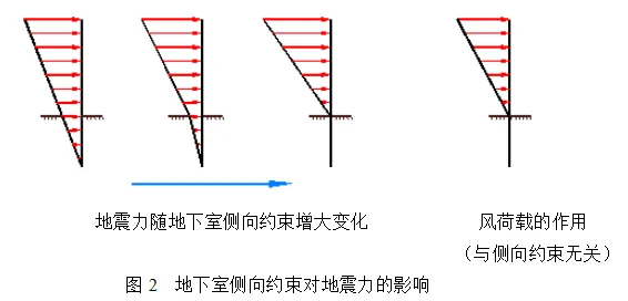 地下室各层地震反应力的大小与地下室的侧向约束相关。当地下室侧向约束越大,地下室结构的水平位移变小,因此地震反应力也会越小。