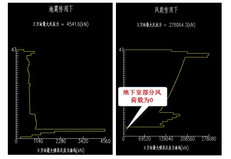 以图示带5层地下室工程为例,从各层地震力图和各层风荷载图可见带地下室结构的地震力和风荷载分布特点。