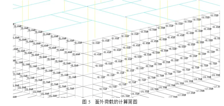 在计算简图中,可以表示墙的面外荷载的情况,从图中可以看出,墙的面外荷载是直接施加到墙面内的各个单元节点上的。
