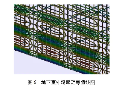 如果在计算参数中勾选了“生成绘等值线用节点应力数据”,则可在计算结果的“等值线”菜单下查看每一片剪力墙在各个荷载工况下的内力等值线图。下图即是地下室外墙在水土压力下的面外弯矩等值线图,在它的各个单元节点上可标出弯矩的数值。