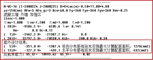 在各层配筋结果文件中,如果某墙柱是承受了水土压力或人防荷载的地下室外墙,则在原有内容之外补充“面外设计结果”,输出了墙的竖向分布钢筋和水平分布钢筋的双侧最大配筋面积,同时给出控制的面外弯矩、轴力和组合号。