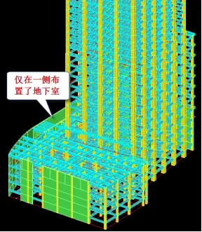 一般应将地下室和其上的上部结构各层共同建立完整的计算模型进行计算分析。上部结构和地下室组成一个承力体系,具有共同的位移场,相互协调变形。共同作用分析可以较准确地得到上部结构对地下室变形的影响,同样也可以较准确地反映地下室结构的变形对上部结构的影响。一般情况下地下室结构的位移对上部结构的水平位移以及受力状态都有影响,因此需要考虑地下室回填土的侧向约束对整体结构水平位移的影响;地下室楼层刚度通常都比较大。另外,规范对于地下室的很多要求、地下室本身的计算等常需要在整体模型中得到体现。