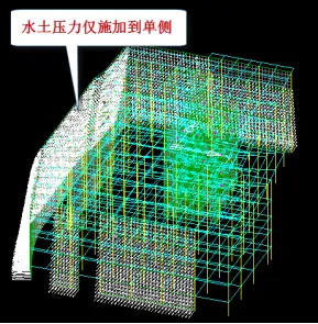 有的工程只在单侧布置了地下室外墙,如在一侧靠山,另一侧开敞的地下室情况。有时地下室虽然两侧布置,但布置并不对程。在这些情况下,地下室周边的土压力、水压力只施加到单侧,这将造成结构的不对称受力。