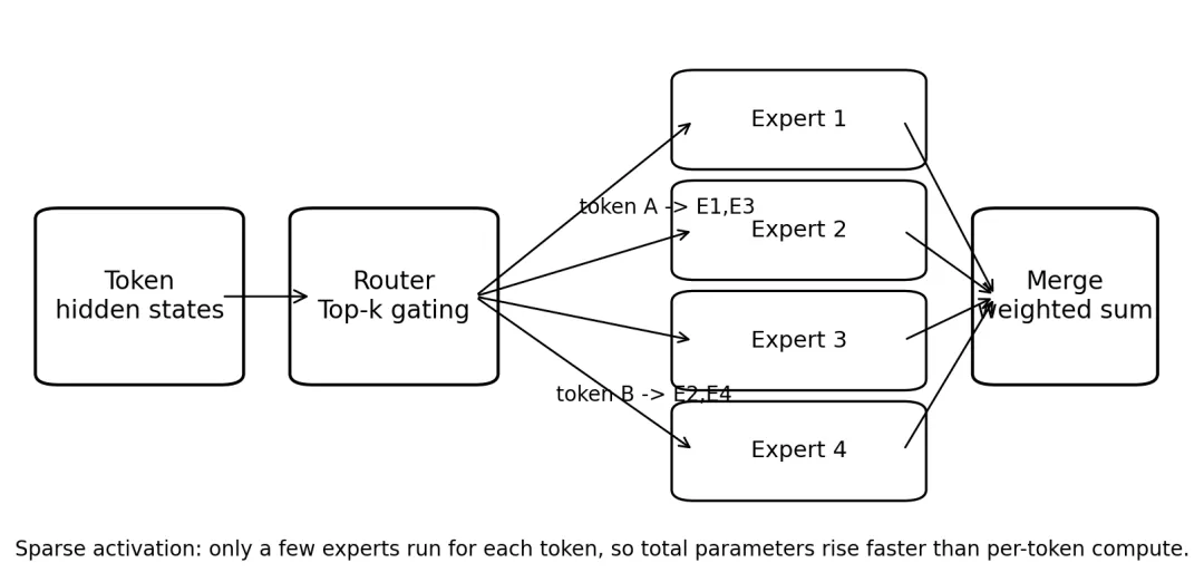 在传统稠密 Transformer 里,每一层前馈神经网络(FFN)的参数都对每个 token 生效。也就是说,只要你把参数规模扩大,几乎意味着每个 token 的前向计算量也随之上升。MoE 的思路不是把所有参数都算一遍,而是把一部分 FFN 替换成多个“专家网络”,再用一个路由器决定当前 token 应该送去哪些专家。于是,模型的“总参数量”可以很大,但对单个 token 来说,只会真的经过其中少数几个专家。这个结构的关键不在“专家”三个字,而在“稀疏激活”。从计算图角度看,MoE 不是让一层更复杂,而是让一层变成一个条件计算系统:不同 token 走不同路径。图 1MoE 的直观结构:Router 决定 token 进入哪些专家,最后再合并输出1. MoE 的最小计算逻辑
