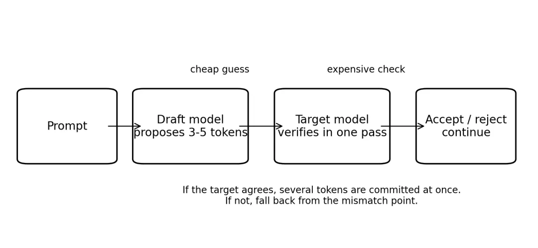自回归推理最慢的地方在于“串行”。目标模型每次只吐出一个 token,而下一个 token 必须等待上一个 token 确认后才能开始。即便 GPU 很强,这个串行依赖仍然限制了端到端时延。Speculative Decoding 的核心想法是:让一个更便宜的小模型先往前猜几步,再由大模型一次性验证这些候选。这里的关键不是让小模型代替大模型,而是把“小模型的便宜”和“大模型的准确”叠起来。只要小模型猜得足够接近,大模型就可以在一次前向里确认多个 token,相当于把原本逐 token 的等待压缩。图 2Speculative Decoding:先猜,再批量验证1. 快在哪里