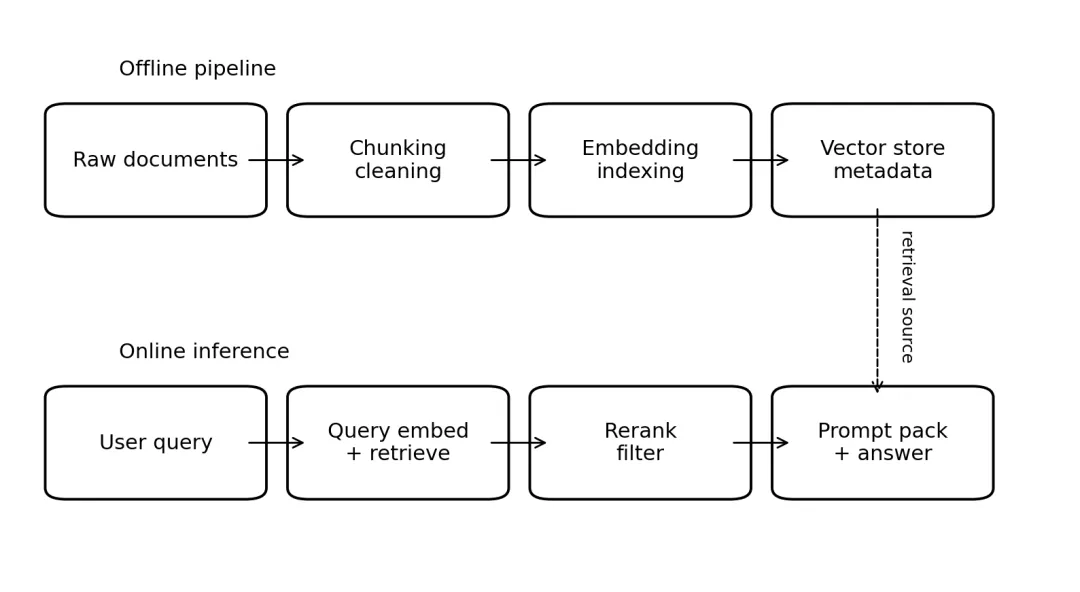 很多人第一次接触 RAG,会把它理解成“把数据库接到模型上”。这不算错,但太粗。更准确地说,RAG 是把“知识获取”拆成两个阶段:先在外部知识库中检索相关片段,再把检索结果作为上下文喂给生成模型。它不是让模型参数本身记住更多,而是让模型在回答前先拿到一份临时参考材料。所以 RAG 不是主干模型训练技术,而是系统编排技术。它非常适合解决三类问题:知识更新频繁、知识属于私域、回答必须可追溯。企业知识库问答、文档助手、代码库助手,大多落在这个范围里。图 3RAG 的典型架构:离线建库 + 在线检索/重排 + 生成1. 离线阶段:真正决定上限的是“怎么切”,不是“有没有库”