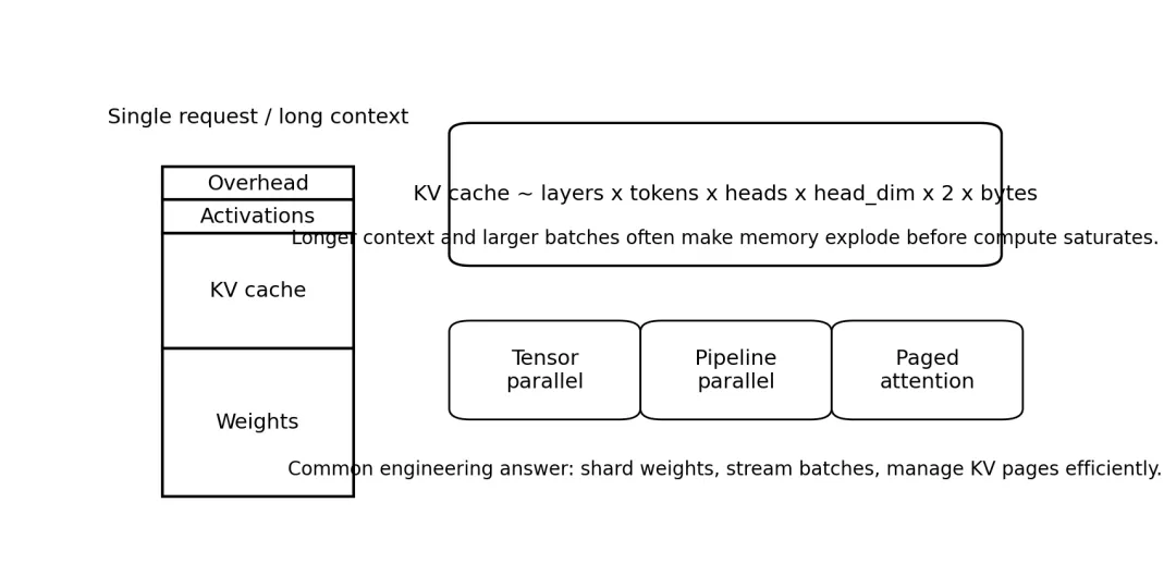 训练阶段大家习惯讨论浮点运算次数、吞吐、优化器状态;到了推理阶段,真正把系统卡住的常常是显存和通信。原因很简单:在线服务不是单条请求顺序执行,而是很多不同长度、不同上下文、不同生成步数的请求同时涌进来。此时,GPU 不只是装模型参数,还要装 KV Cache、批处理队列、临时激活以及各种运行时缓冲。对长上下文模型尤其如此。随着上下文长度增加,权重大小并不会变化,但 KV Cache 会随 token 数线性增长。于是,很多场景下瓶颈从“模型有多大”转移到“上下文有多长、并发有多高”。图 4推理显存并不只由权重决定,KV Cache 往往成为主导项1. 为什么 KV Cache 会越来越大