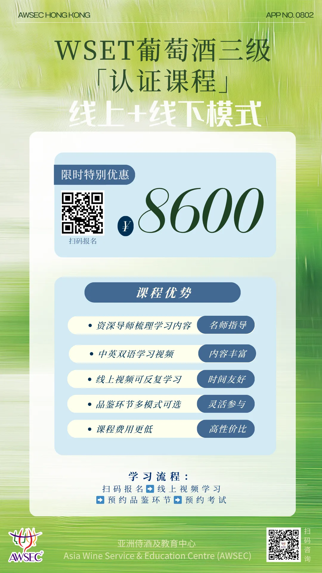 该模式的学习课程旨在让您兼顾现有日程的同时,向您提供全面的葡萄酒高级资格课程。「WSET三级葡萄酒证书课程」适合有志对葡萄酒作深入认识的专业人士及爱好者报读。其内容已全面革新,学习重点全投放在葡萄酒,删除烈酒相关内容。同学将深入学习到葡萄种植、葡萄酒酿造、葡萄酒风格,品质和影响价格的综合知识,并按不同的葡萄酒风格学习专业品酒技巧。 在课堂上,同学将品尝将以风格为本而非按国家为分类的各种葡萄酒,以强化学生对葡萄酒风格以质量为先的概念。此外,课程设计结构、课程教科书,学习指南及辅助教材亦全线升级,借此提升同学生学习经验。- 由 AWSEC 资深讲师主讲的 6 节 (共 14 小时) 实时网课 及 复习课