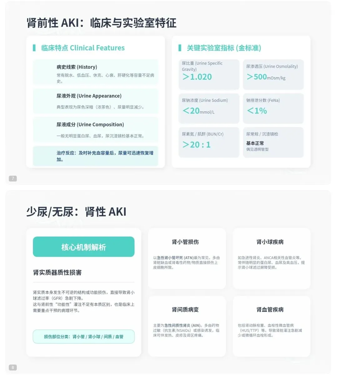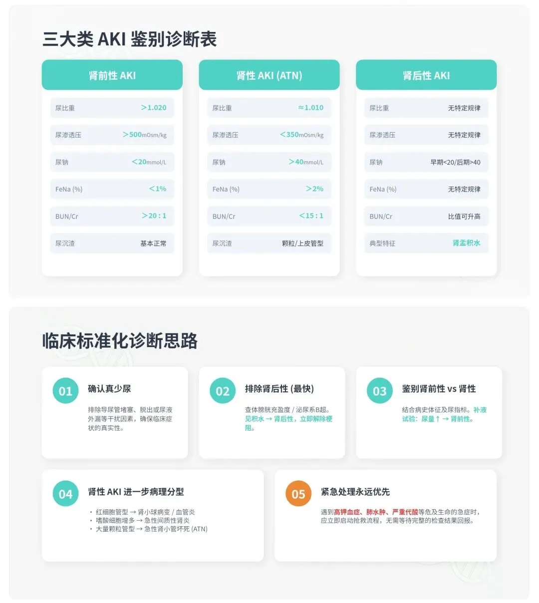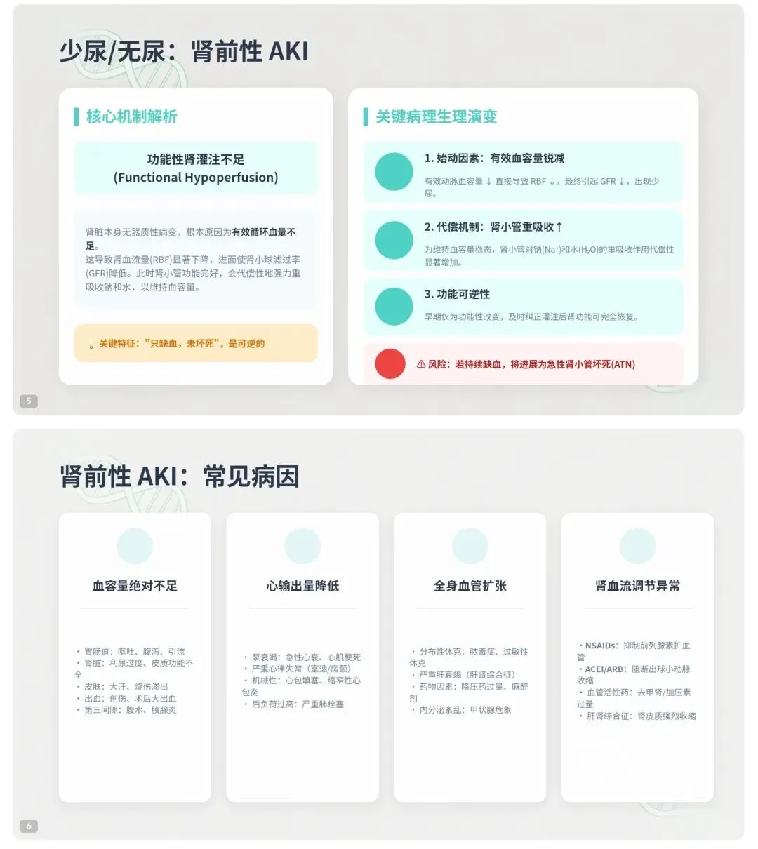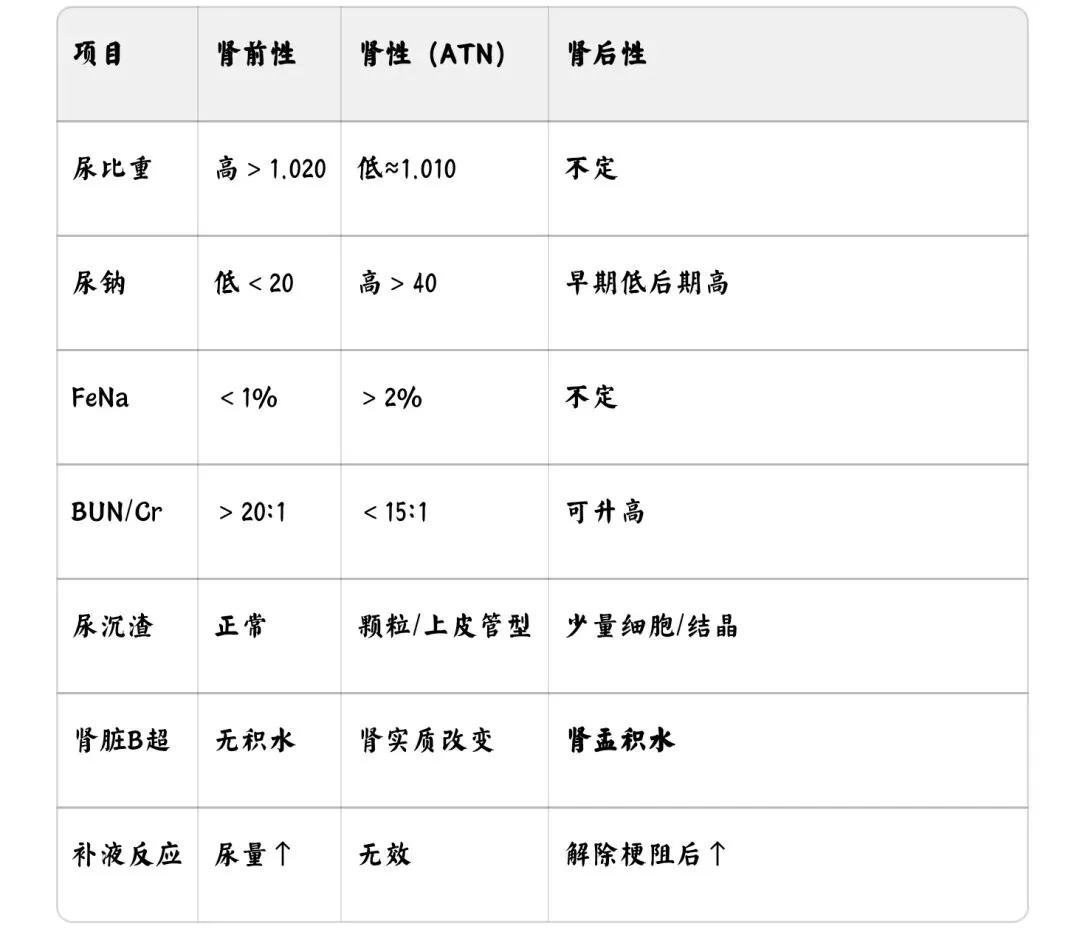 三大病因:肾前性 → 肾性 → 肾后性