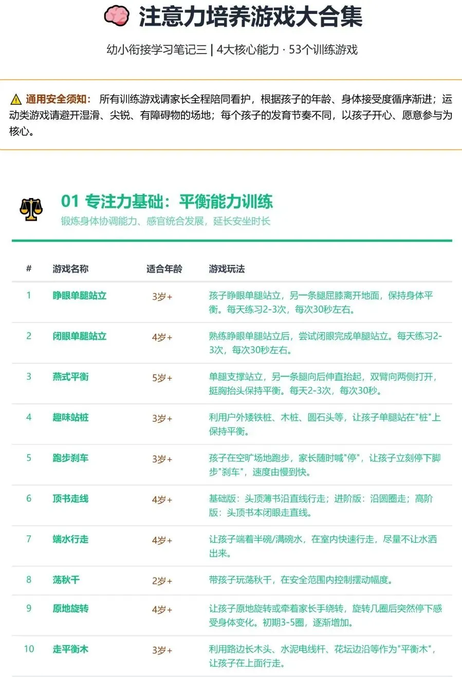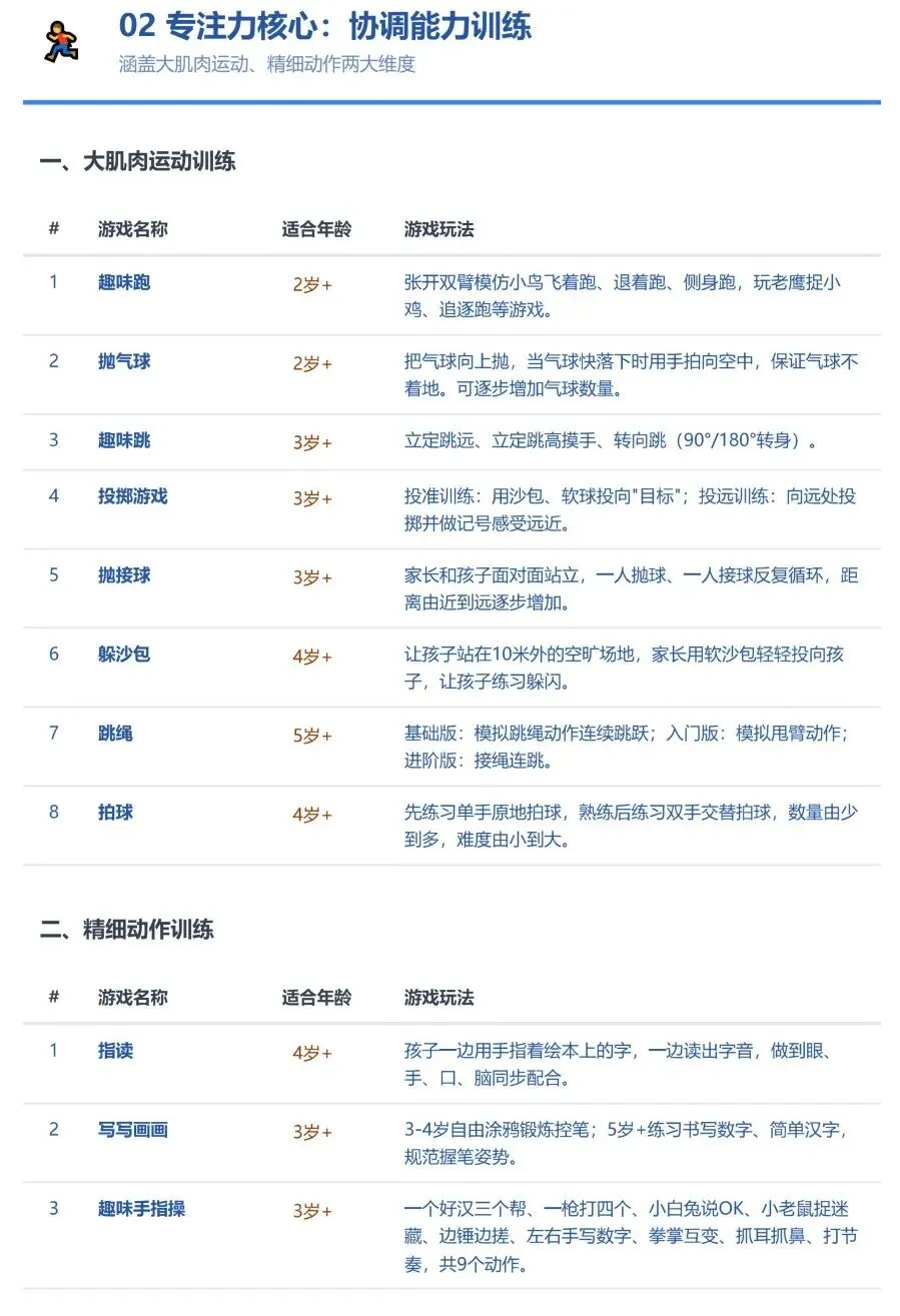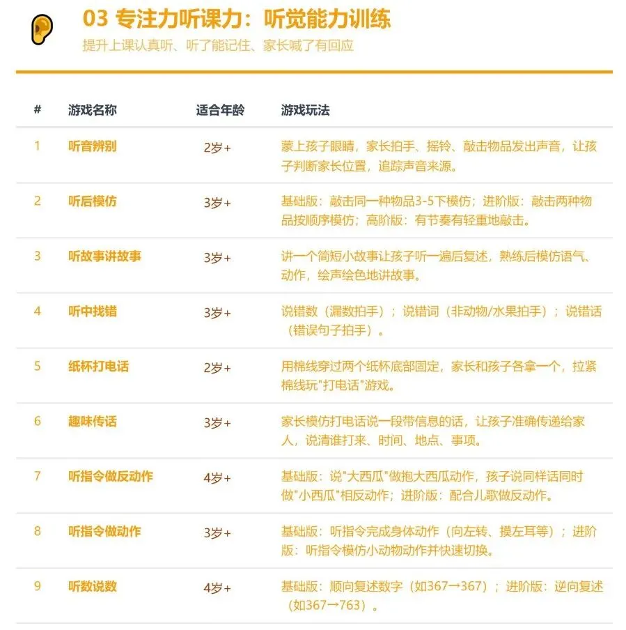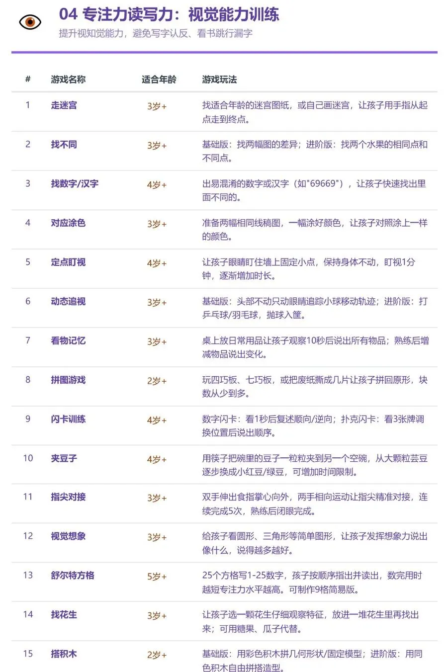 今天给大家整理了 4 大核心能力、30 + 个在家就能玩的专注力训练游戏,不用买昂贵教具,不用报班,3 岁 + 孩子就能上手,每天花 10 分钟,陪娃玩着练出好专注力!