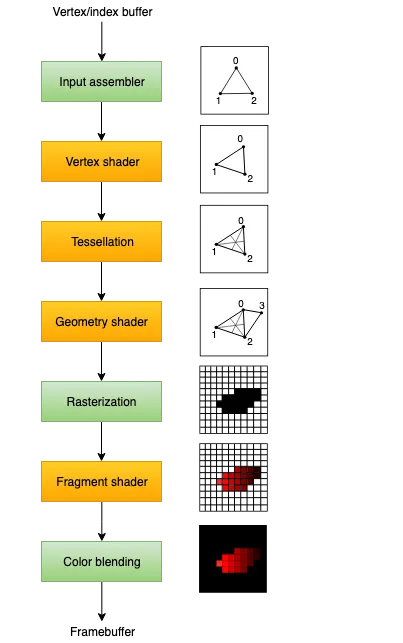 在接下来的几章中,我们将设置一个图形管线,这个管线被配置为绘制我们的第一个三角形。图形管线是一系列操作的序列,这些操作将网格的顶点和纹理一路转换到渲染目标中的像素。下图显示了一个简化的概述: