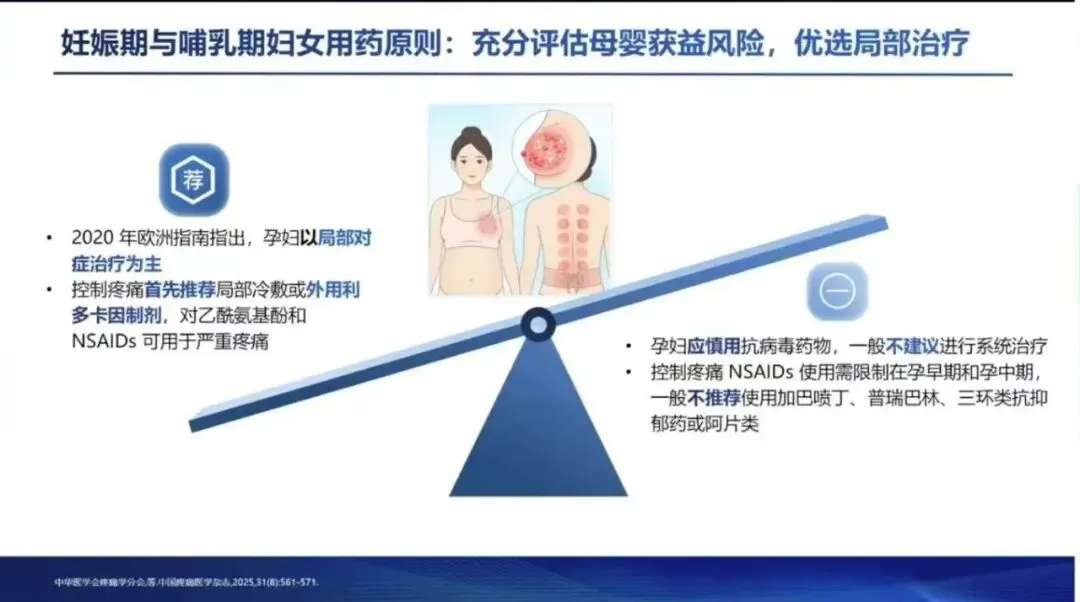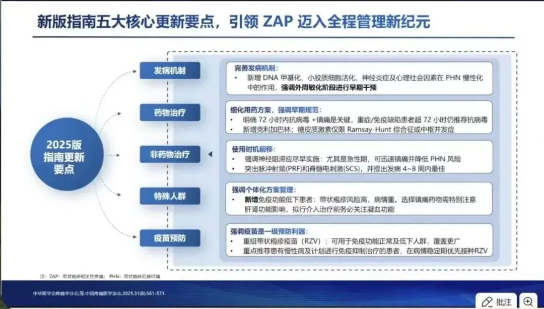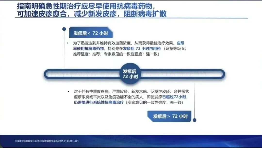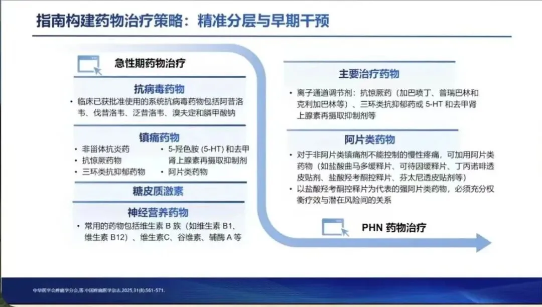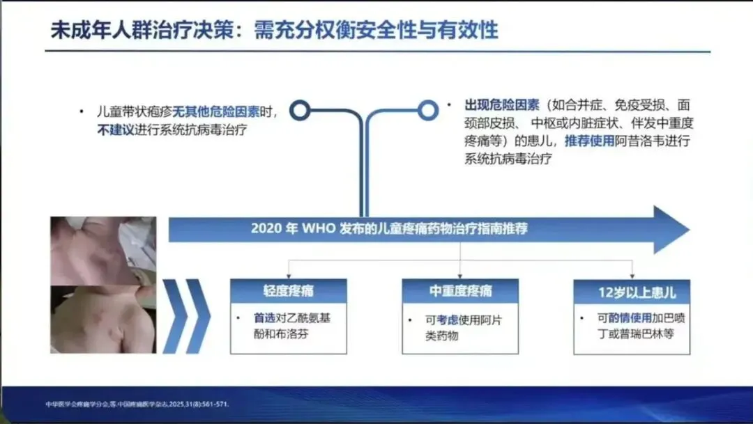 本期内容来自优麦医生APP. 栏目“[樱花皮肤健康论坛第六季第二期]ZAP全程管理”,《聚焦ZAP全程管理——解析ZAP全程管理指南更新要点与临床实践新策略》,主讲人:戴洁 教授。急性期如无禁忌,建议联用非甾体类抗炎药;核苷类药物,说明书用量低于指南推荐用量,做好患者知情同意;磷甲酸钠仅作为核苷类药物禁忌情况下二线选择;溴夫定作为高效抗病毒药物,除外近期应用过氟尿嘧啶类药物、白细胞/粒细胞减少/骨髓抑制外,可作为优选,因价格较高,需做好患者知情同意。急性期剧烈疼痛是发生PHN的危险因素,尽早干预可降低发生PHN的概率。