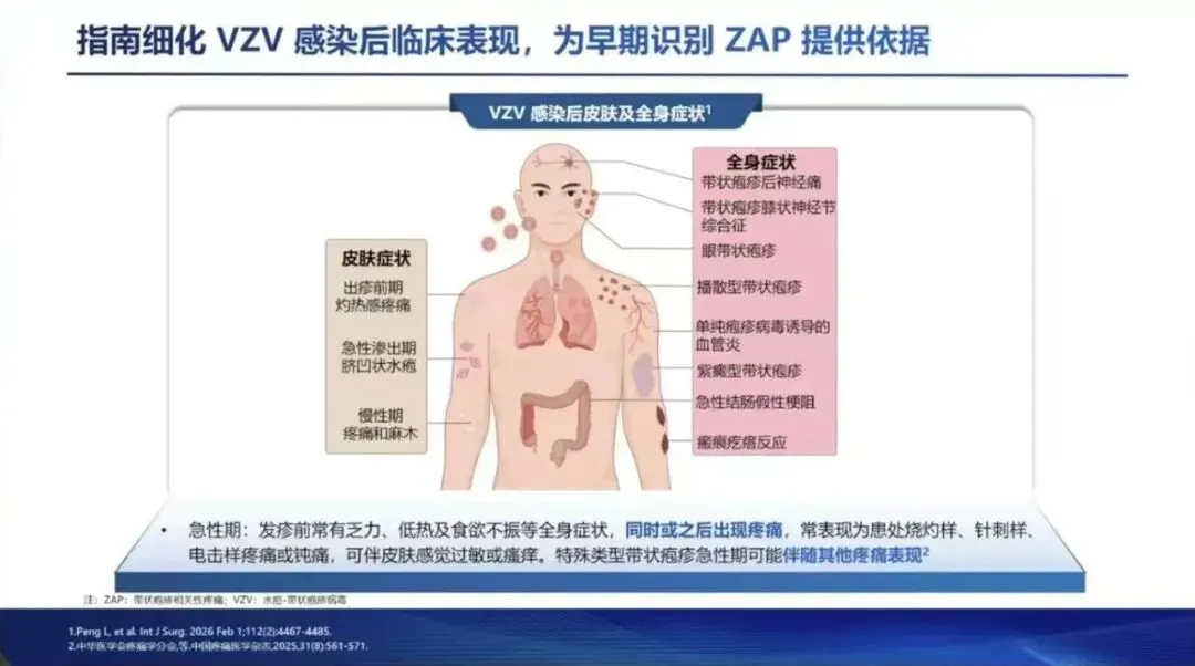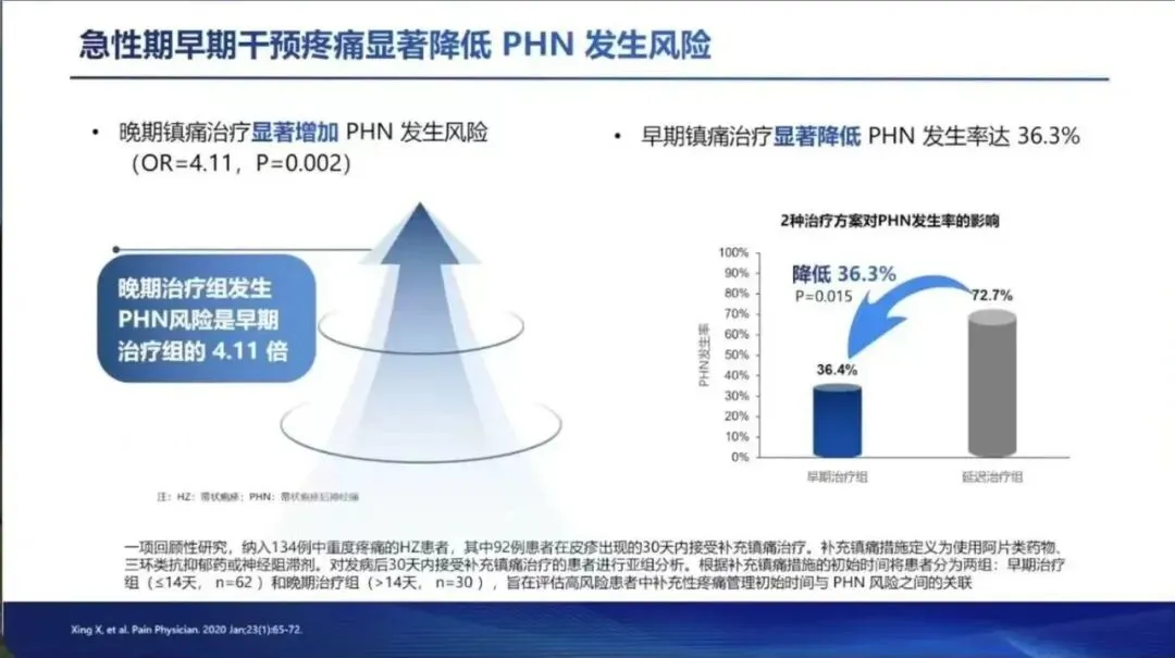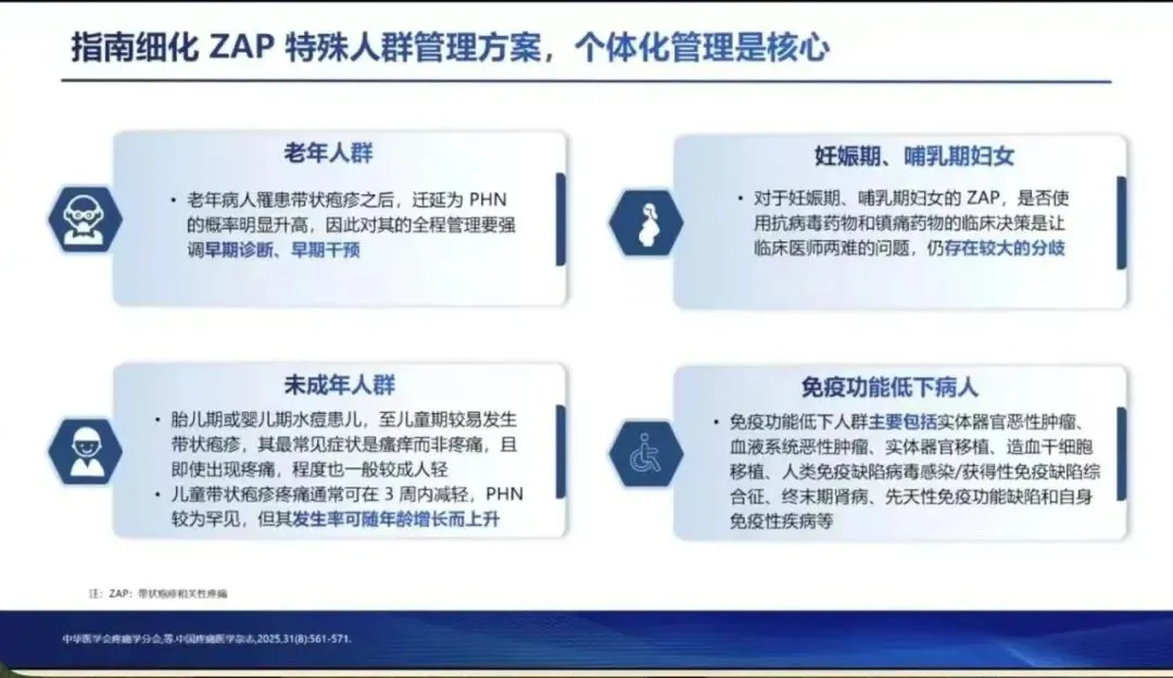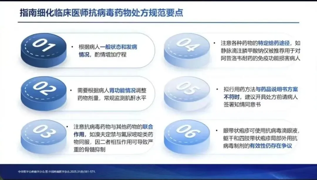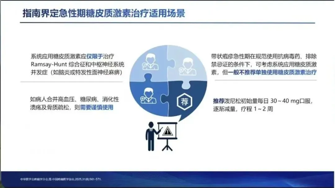 本期内容来自优麦医生APP. 栏目“[樱花皮肤健康论坛第六季第二期]ZAP全程管理”,《聚焦ZAP全程管理——解析ZAP全程管理指南更新要点与临床实践新策略》,主讲人:戴洁 教授。急性期如无禁忌,建议联用非甾体类抗炎药;核苷类药物,说明书用量低于指南推荐用量,做好患者知情同意;磷甲酸钠仅作为核苷类药物禁忌情况下二线选择;溴夫定作为高效抗病毒药物,除外近期应用过氟尿嘧啶类药物、白细胞/粒细胞减少/骨髓抑制外,可作为优选,因价格较高,需做好患者知情同意。急性期剧烈疼痛是发生PHN的危险因素,尽早干预可降低发生PHN的概率。