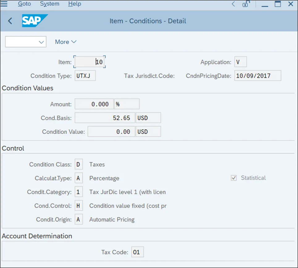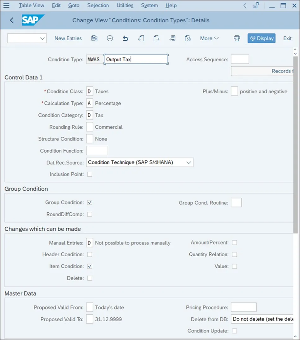 现在,让我们来研究一下应收账款流程中的税收问题。这里会使用销售(销项)税码,这些税码通常在财务会计发票中手动输入,而在集成的 SAP S/4HANA 销售开票文档中则会自动确定。当你直接在财务会计中录入一张销项发票时,通常需要手动输入税码,除非有某种替代设置可以自动确定税码。在使用事务代码 FB70 在财务会计中过账客户发票时,在表头部分的“税务”选项卡下,你可以输入必要的税务信息,如下图所示。选择销售销项税码,如有必要,还需选择税务管辖区代码,该代码将使用基于美国特定管辖区的税率。如果你选中“计算税款”复选框,系统将自动计算税款。在销售流程中,可以使用我们之前讨论过的定价程序中其他元素所使用的相同条件技术来自动确定税码。实际上,税收是定价程序中的一个单独条件类型,它处于销售订单级别。双击条件类型 UTXJ:税务管辖区代码。如下图所示,系统根据找到的条件记录确定税码为 01。销售中的税收确定使用与采购类似的条件技术(条件、访问序列、条件表)来自动确定税款。可以使用特殊的税收定价条件,根据为条件表配置的字段来确定合适的税码。要定义一个条件类型,请按照菜单路径“销售与分销”→“基本功能”→“定价”→“定价控制”→“定义条件类型”操作。然后,选择“为定价设置条件类型”活动。系统将显示已定义的销售条件(见下图)。SAP S/4HANA 标准的销项税条件是 MWAS,如果需要,你可以复制它作为自己以 Z 或 Y 开头的条件。条件类别:该字段确定条件类型的用途。在我们的示例中,条件类别设置为 D:税收,这将此条件定义为税收条件。计算类型:指定计算类型,设置为 A:百分比,因为销项销售税应按百分比计算。条件分类:对条件进行分类,对于税收条件,应设置为 D:税收。项目条件:对于税收应选择此项,因为此复选框确保计算在项目级别进行,这对于税收来说是必需的。通过点击“访问记录”按钮,你可以确定为条件类型维护了哪些访问记录,这些记录将确定税码。你若喜欢,点个❤️谢先👇