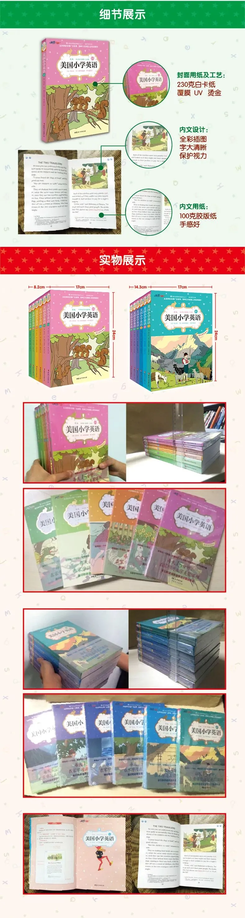 (识别上方二维码 进入学习美国小学英语视频讲解课)金杯、银杯不如大家的口碑,《美国小学英语》出版至今受到了众多家长的肯定和称赞,下面这些只是一部分,一起来感受一下。它们是20世纪上半叶美国最优秀的英语阅读教材,由美国教育界权威性人物,教育理论家和教育实践家主编,贯穿着美国人的思维方式,包含着浓浓的美国文化气息。引入本系列的初衷,是让国内的英语学习者,从一开始就接触正宗的美式英语,近距离接触美国原味文化,从“根语言”学起。这些图书在美国已经使用了近一个世纪,尤其是“婴儿潮”那代人,都是读着这些教材长大的。如今,那一代人已成为美国社会各个领域的中坚力量,从当今总统,到企业巨子和商业大亨,乃至科技、教育、文化、艺术等专业领域的权威名流,应有尽有。怎么样?正在为孩子选择英语书的你,是不是想更多了解一下呢?说起这套书也是大有来头,它是上世纪美国主流学校长期广泛使用,影响了几代美国人的经典教材!它曾在美国精英阶层广泛流行,陪伴了很多美国中产家庭度过了珍贵的童年时光。本套教材分6个年级,每年级 2册,共12册。它的魅力与《美国幼儿启蒙英语》是一脉相承的,前面介绍到的特色它基本都有,赠送:MP3、微课,为孩子打造纯美语语音环境。好多中国小朋友从这套书中受益匪浅,现在,他们都读得好棒呢!让我们一起来欣赏一下吧!感觉不错吧,现在跟我一起来了解一下其中一册的内容,你会爱上它的。从幼儿园到小学校,孩子们的活动空间大大地拓展了。因此,本级的多数故事都以动物为主人公,透过简短有趣的情节传递有用的知识,并巧妙地达到学习语言的目的。A册以一个英文句子为一行,B册逐渐出现了两三个句子组成的短小段落。简单的句型、数量不多的新词在精彩的故事中不断重复出现,非常易于掌握。美国哥伦比亚大学表演系研究生配音,纯正美语从听开始为本书配音的是美国哥伦比亚大学表演系研究生Betina和Devin,真正的世界名校高材生啊!他们纯正地道的美式发音,原汁原味,音质清晰优美,生动鲜活,极富表现力。他们用最正宗的美语为孩子打造出纯正的听觉环境,妈妈再也不用担心孩子的发音“跑偏”啦!这套书与一般引进书最大的区别是,它除了几十本纸质书还有——丰厚的附加值——强大的视听资源!几乎所有的视听形式都配备上了,真正用心良苦啊!沧浪文化书馨网可以免费下载mp3,看微课;微信公众号上免费在线听音频、看微课;让孩子在家也好,出门也罢;有网也好,无网也罢,都可以听英语磨耳朵!点上方小程序参与抢购
