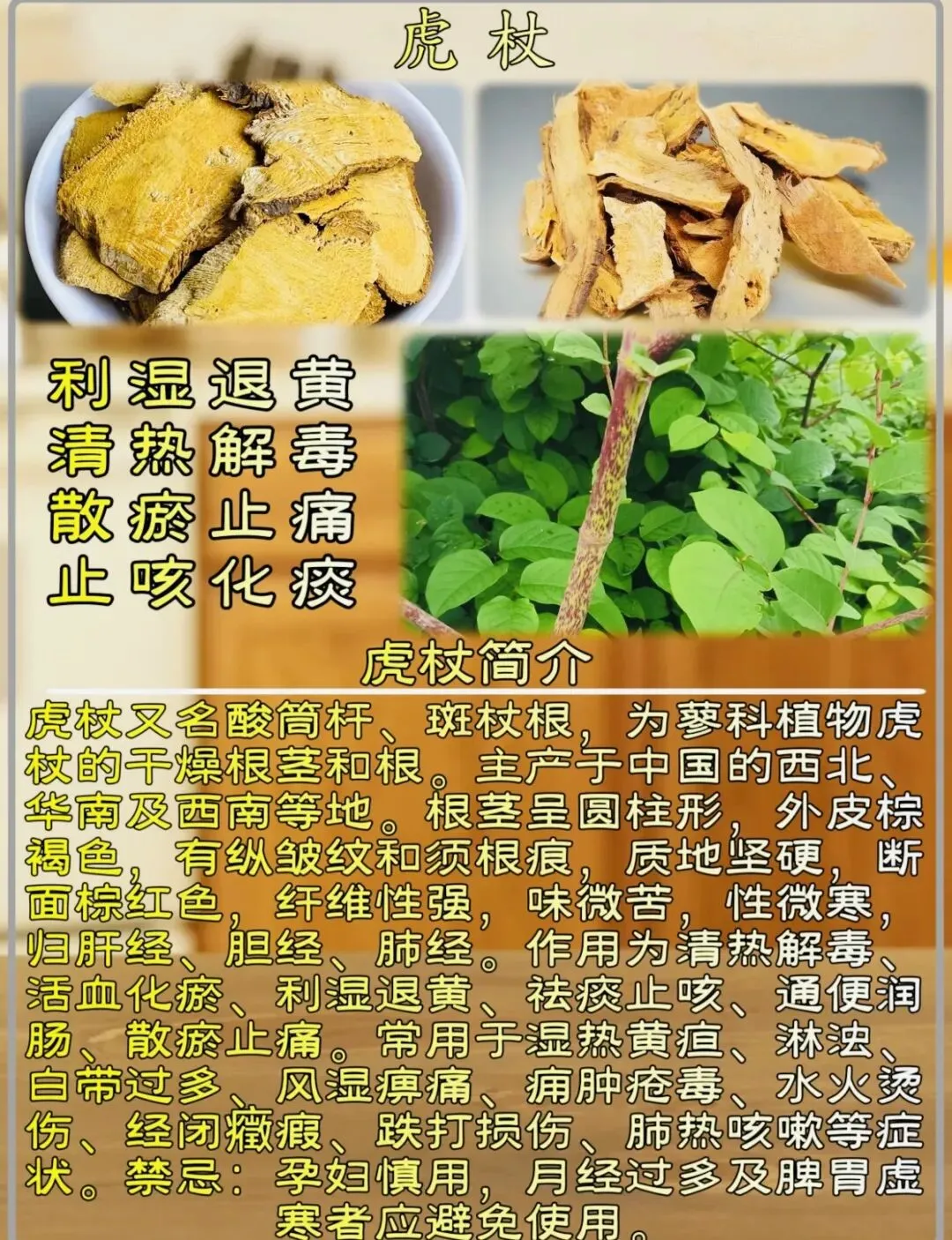 (3)虎杖:化痰止咳、祛风通络(区别于大黄)。