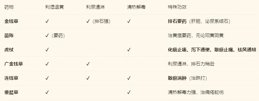 (1)茵陈 vs 金钱草:茵陈专于退黄(要药),金钱草长于排石(兼退黄)。