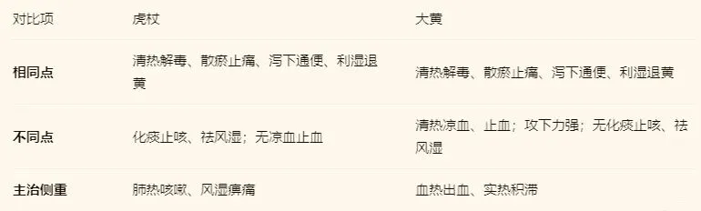 ②不同:大黄:泻下攻积力强,凉血止血(治血热出血)。虎杖:化痰止咳(治肺热咳嗽),祛风通络(治风湿痹痛)。