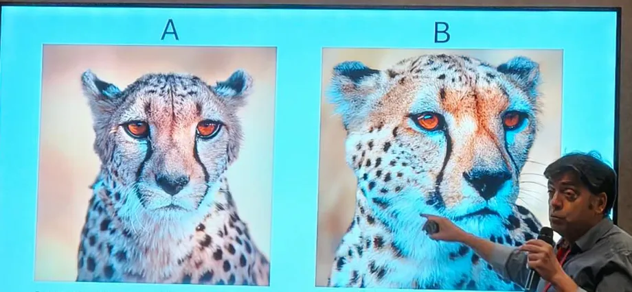 比如John展示了两张猎豹的图片,让现场的老师判断哪个是真实猎豹,哪个是AI生成的。现场一半的老师都判断错了。大家也可以判断一下A和B哪个是真实的,哪个是AI生成的呢?可以评论区互动下哦~