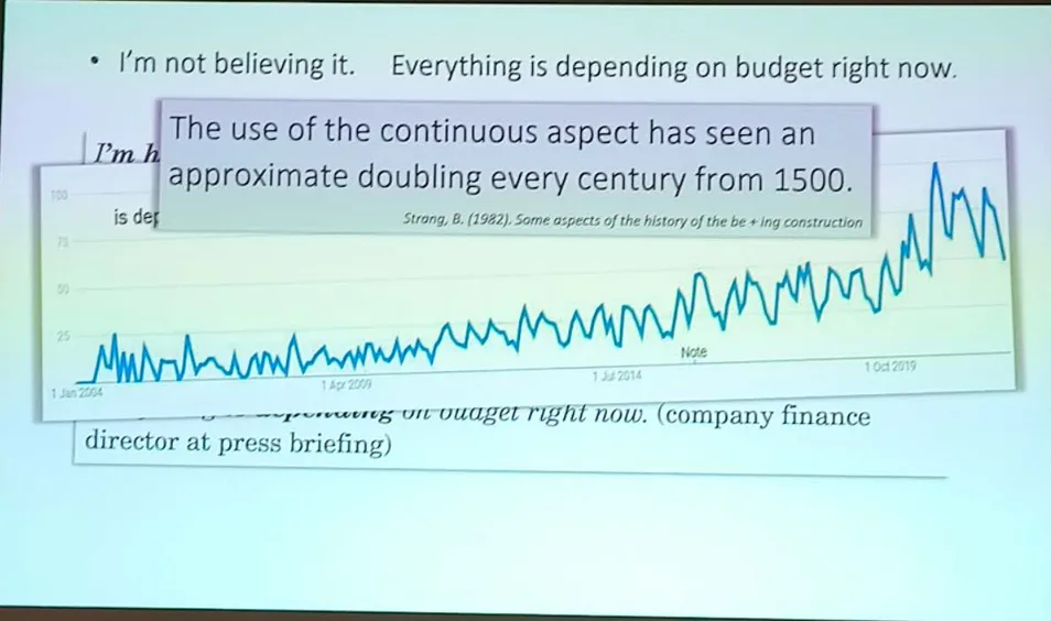 Stative Verbs 的进行时: 以前说 "love/want/hear/believe" 不能用进行时,但现在 "I'm loving/I'm hearing/I'm not believing"等已经随处可见。下图曲线可直观看出自16世纪以来这一变化显著增多。